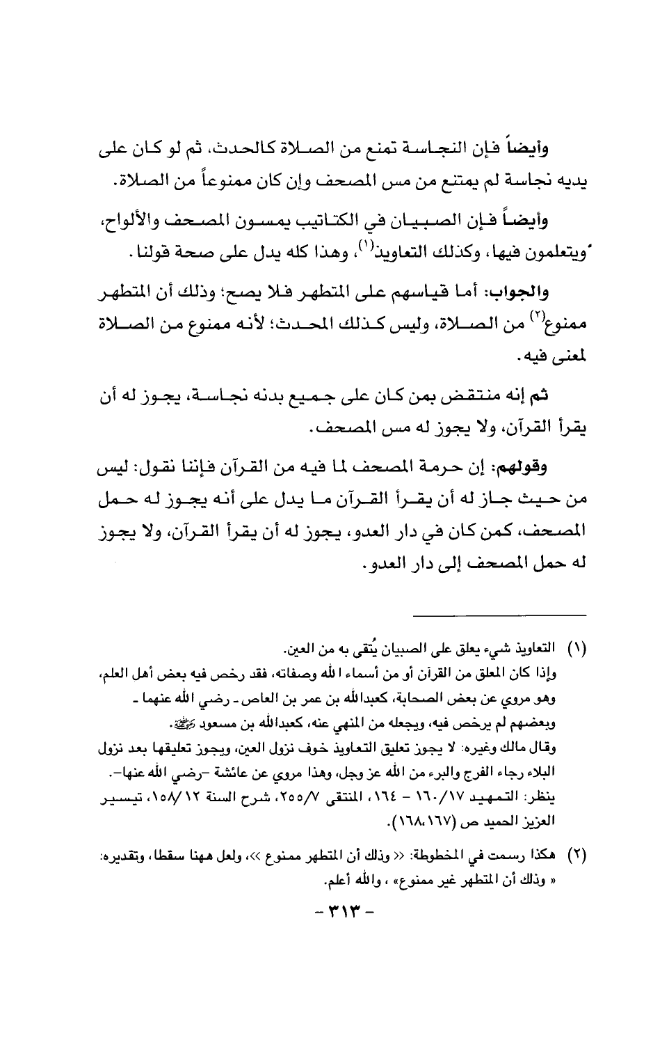وقولهم: إن حرمة المصحف لما فيه من القرآن فإننا نقول: ليس من حيث جاز له أن يقرأ القرآن ما يدل على أنه يجوز له حمل المصحف، كمن كان في دار العدو يجوز له أن يقرأ القرآن، ولا يجوز له حمل المصحف إلى دار العدو.