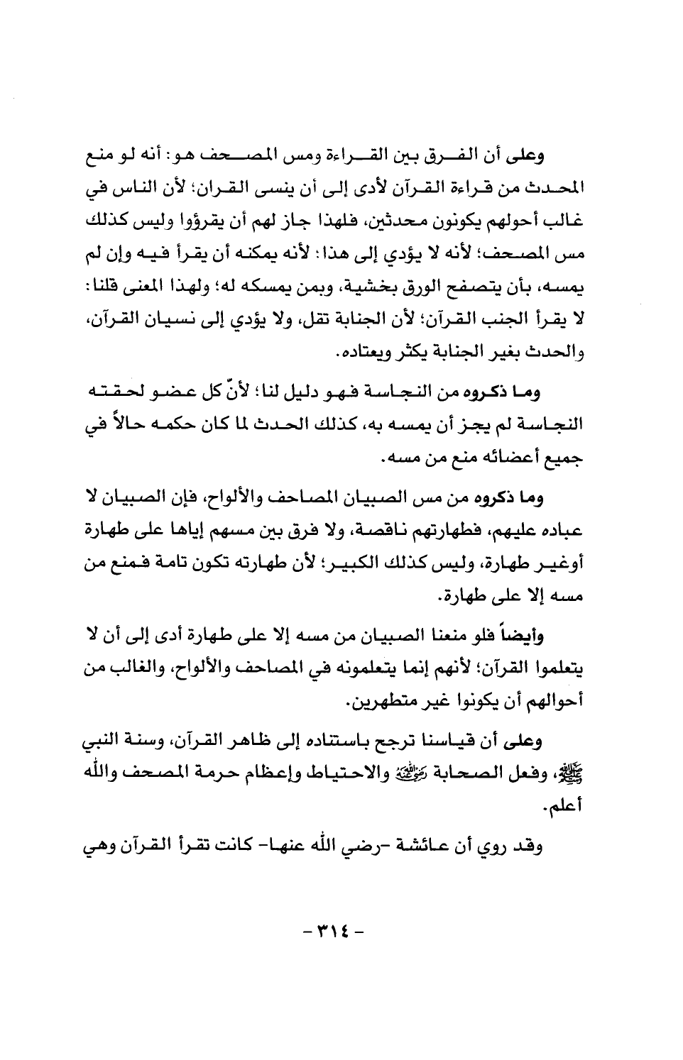 وأيضاً فلو منعنا الصبيان من مسه إلا على طهارة أدَّى إلى أن لا يتعلموا القرآن؛ لأنَّهم إنما يتعلمونه في المصاحف والألواح، والغالب من أحوالهم أن يكونوا غير متطهرين.