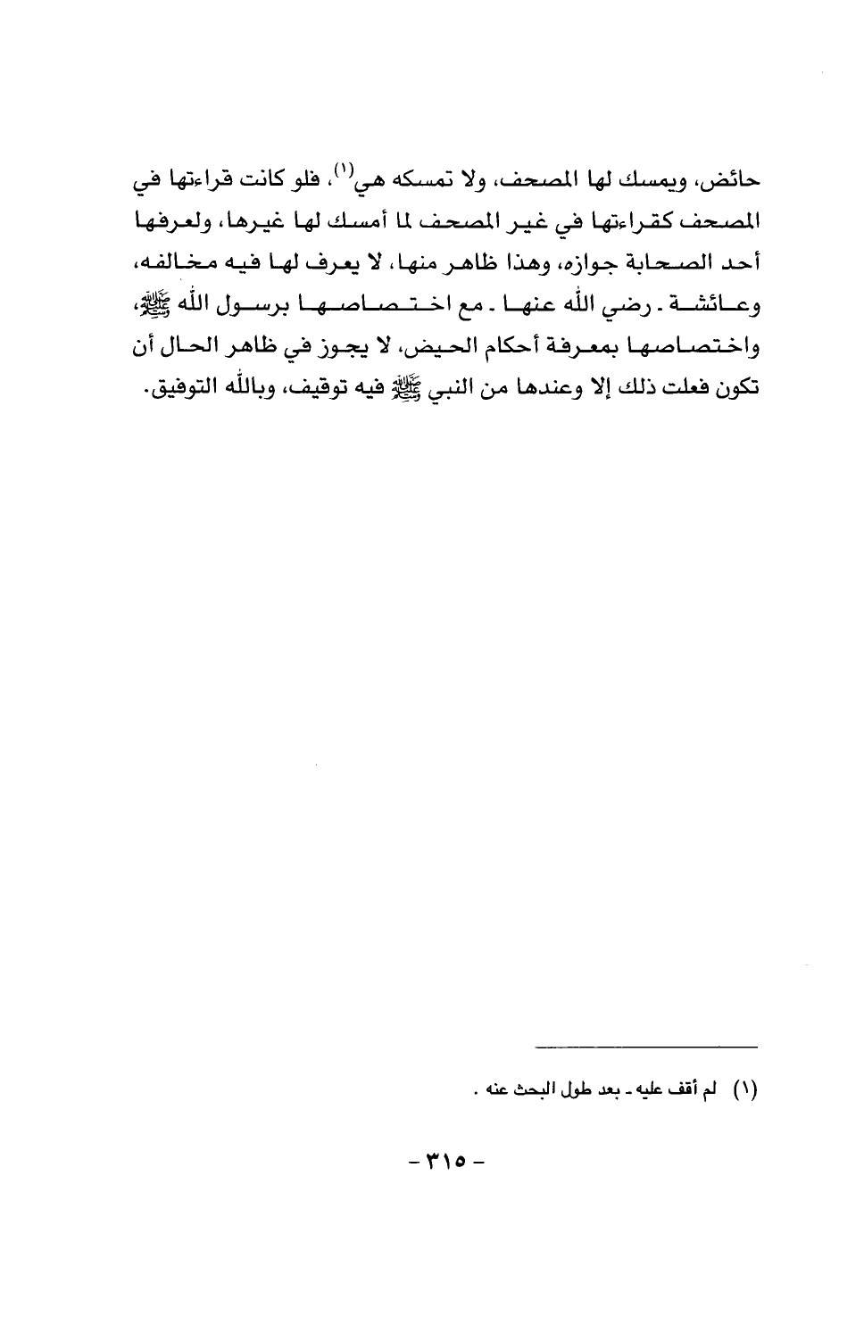 حائض، ويمسك لها المصحف، ولا تمسكه هي، فلو كانت قراءتها في المصحف كقراءتها في غير المصحف لما امسك لها غيرها، ولعرفها أحد الصحابة جوازه، وهذا ظاهر منها، لا يعرف لها فيه مخالفة، وعائشة -رضي الله عنها - مع اختصاصها برسول الله صَلَّى اللَّهُ عَلَيْهِ وَسَلَّمَ واختصاصها بمعرة أحكام الحيض، لا يجوز في ظاهر الحال أن تكون فعلت ذلك إلا وعندها من النبي صَلَّى اللَّهُ عَلَيْهِ وَسَلَّمَ فيه توقيف، وبالله التوفيق.
