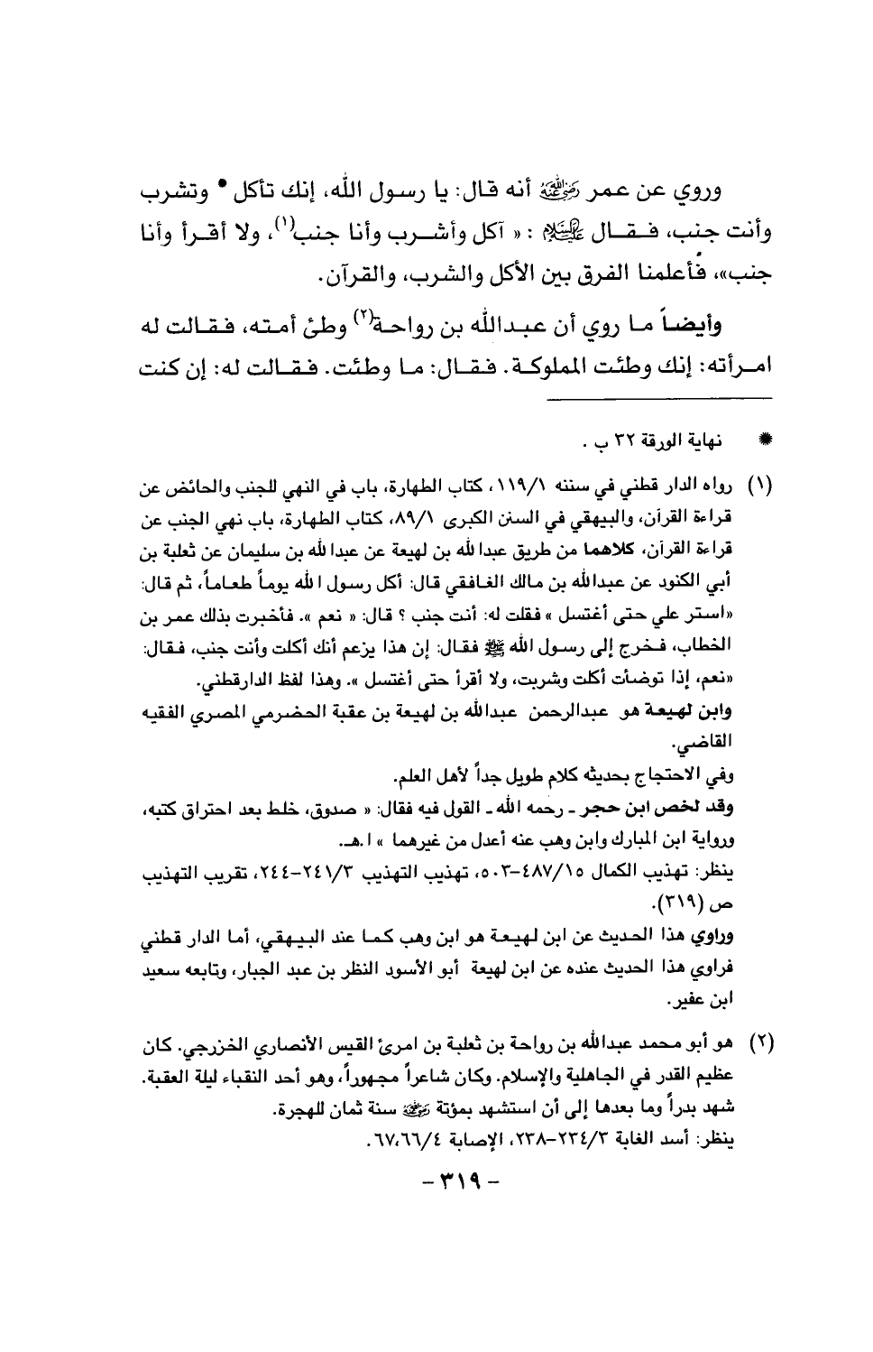 وروي عن عمر رضي الله عنه أنه قال: يا رسول الله، إنَّك تأكل، وتشرب وأنت جنب، فقال عليه السلام: «آكل وأشرب وأنا جنب، ولا اقرأ وأنا جنب، فأعلمنا الفرق بين الأكل والشرب، والقرآن».