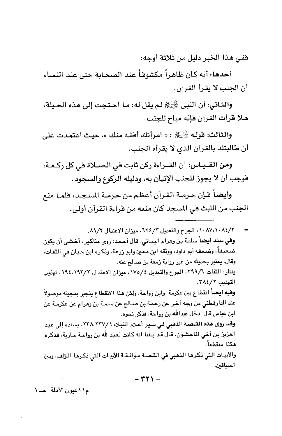 والثالث: قوله عليه السلام: «امرأتك أفقه منك»، حيث اعتمدت على أن طالبتك بالقرآن الذي لا يقرأه الجنب.