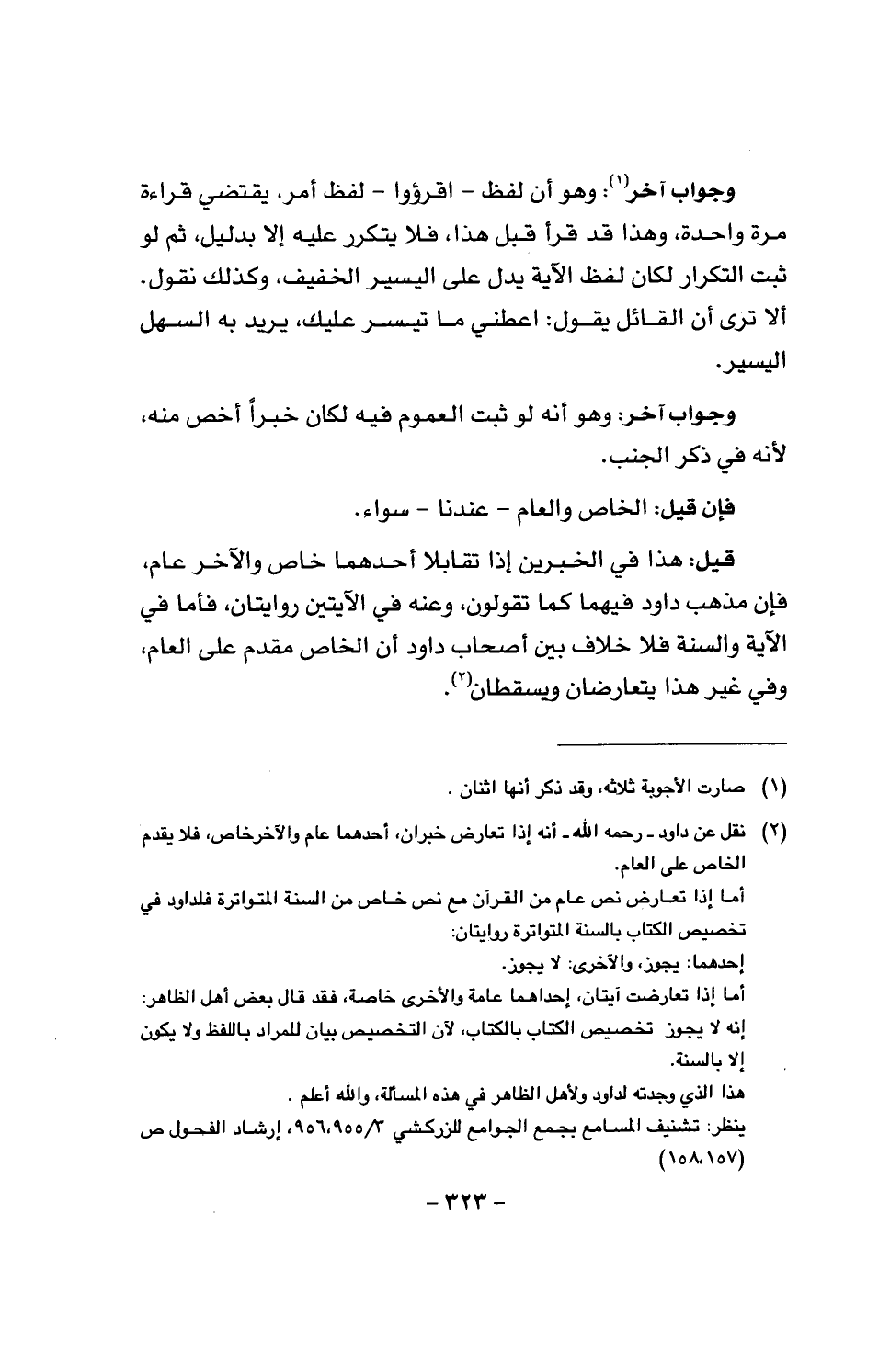 قيل: هذا في الخبرين إذا تقابلا أحدهما خاص والآخر عام، فإن مذهب داود فيهما كما تقولون، وعنه في الآيتين روايتان، فأما الآية والسنة فلا خلاف بين أصحاب داود أن الخاص مقدم على العام، وفي غير هذا يتعارضان ويسقطان.