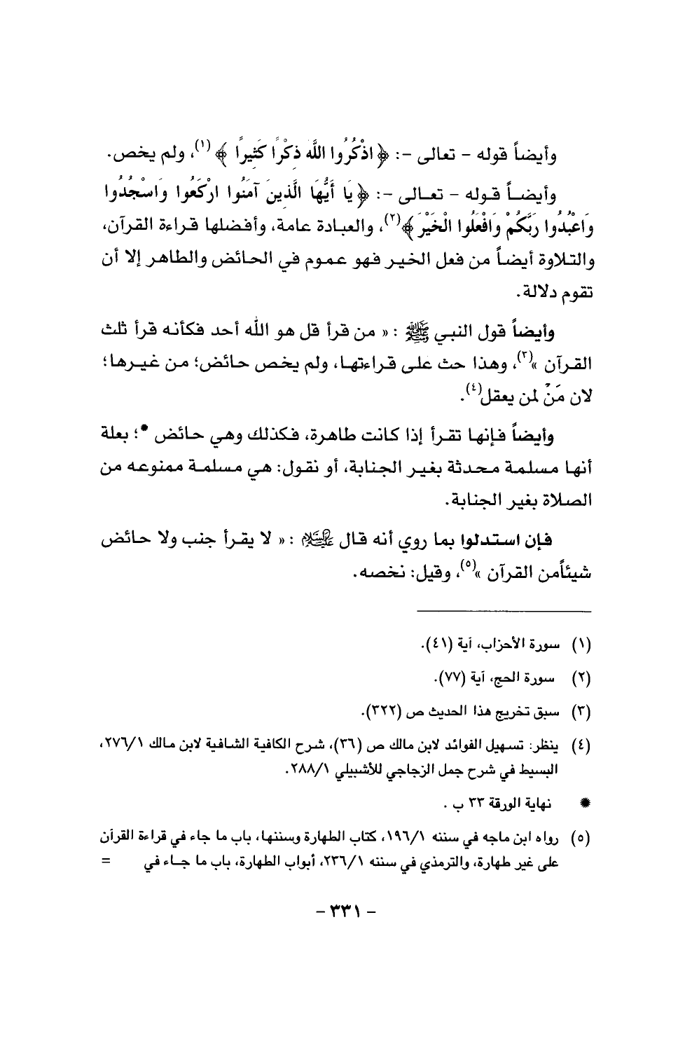وأيضاً قوله -تعالى - {يَا أَيُّهَا الَّذِينَ آمَنُوا ارْكَعُوا وَاسْجُدُوا وَاعْبُدُوا رَبَّكُمْ وَافْعَلُوا الْخَيْرَ}، والعبادة عامة، وأفضلها قراءة القرآن، والتلاوة أيضاً من فعل الخير فهو عموم في الحائض والطاهر إلا أن تقوم دلالة.