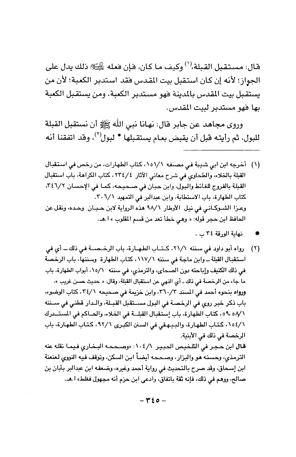 وروى مجاهد عن جابر قال: نهانا نبي الله صَلَّى اللَّهُ عَلَيْهِ وَسَلَّمَ أن نستقبل القبلة للبول، ثم رايته أن يقبض بعام يستقبلها لبول، وقد اتفقنا أنه