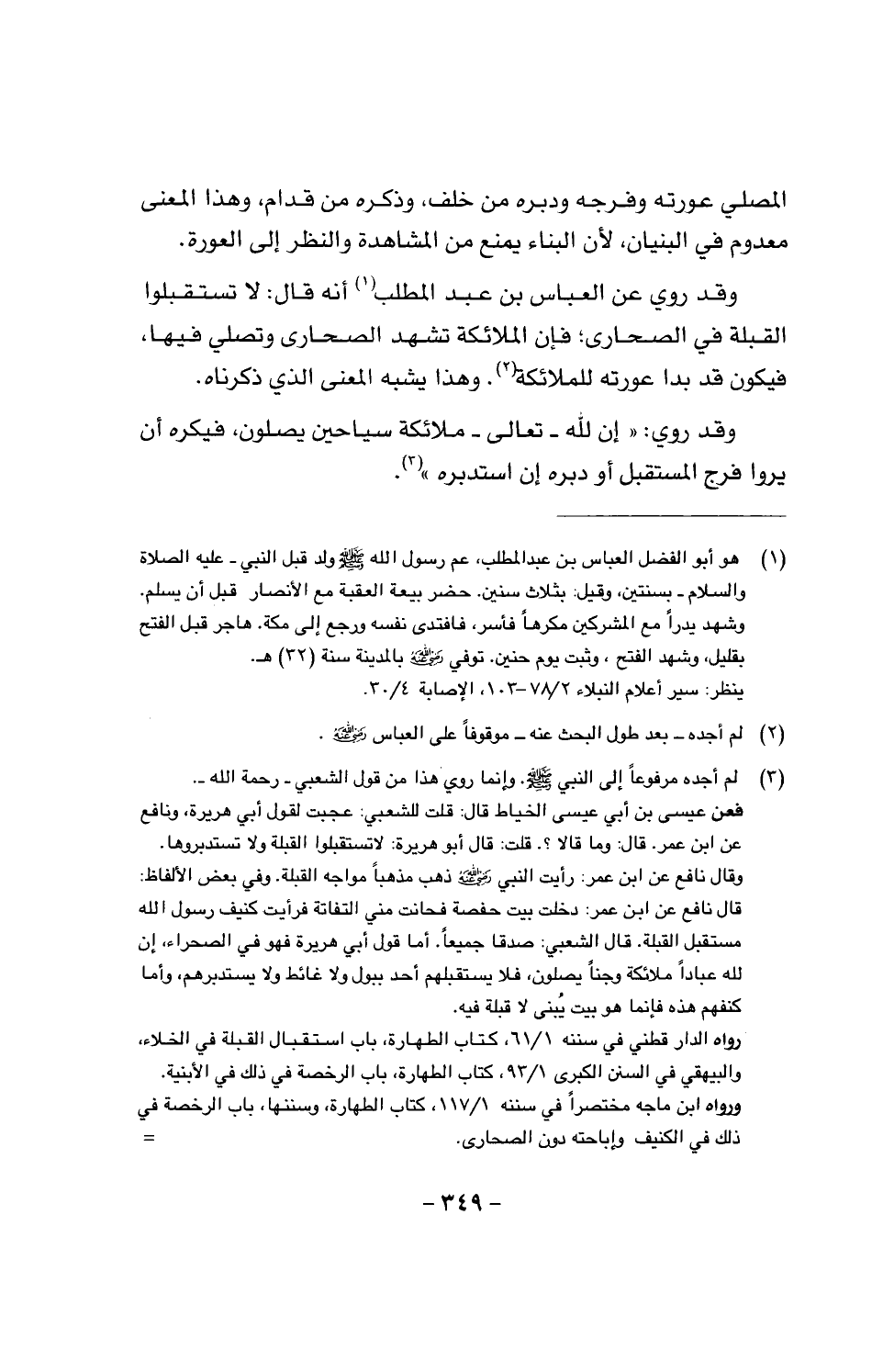 وقد روي عن العباس بن عبد المطلب أنه قال: لا تستقبلوا القبلة في الصحارى؛ فإن الملائكة تشهد الصحارى وتصلي فيها، فيكون قد بدا عورته للملائكة، وهذا يشبه المعنى الذي ذكرناه.