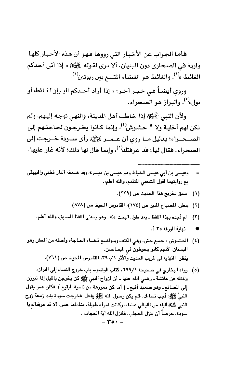 ولأن النبي عليه السلام إذا خاطب أهل المدينة، والنهي توجه إليهم، ولم تكن لهم أخلية ولا حشوش، وإنما كانوا يخرجون لحاجتهم إلى الصحراء؛ بدليل ما روي أن عمر رضي الله عنه رأى سودة خرجت إلى الصحراء، فقال لها: قد عرفتك، وإنما قال لها ذلك؛ لأنه غار عليها.