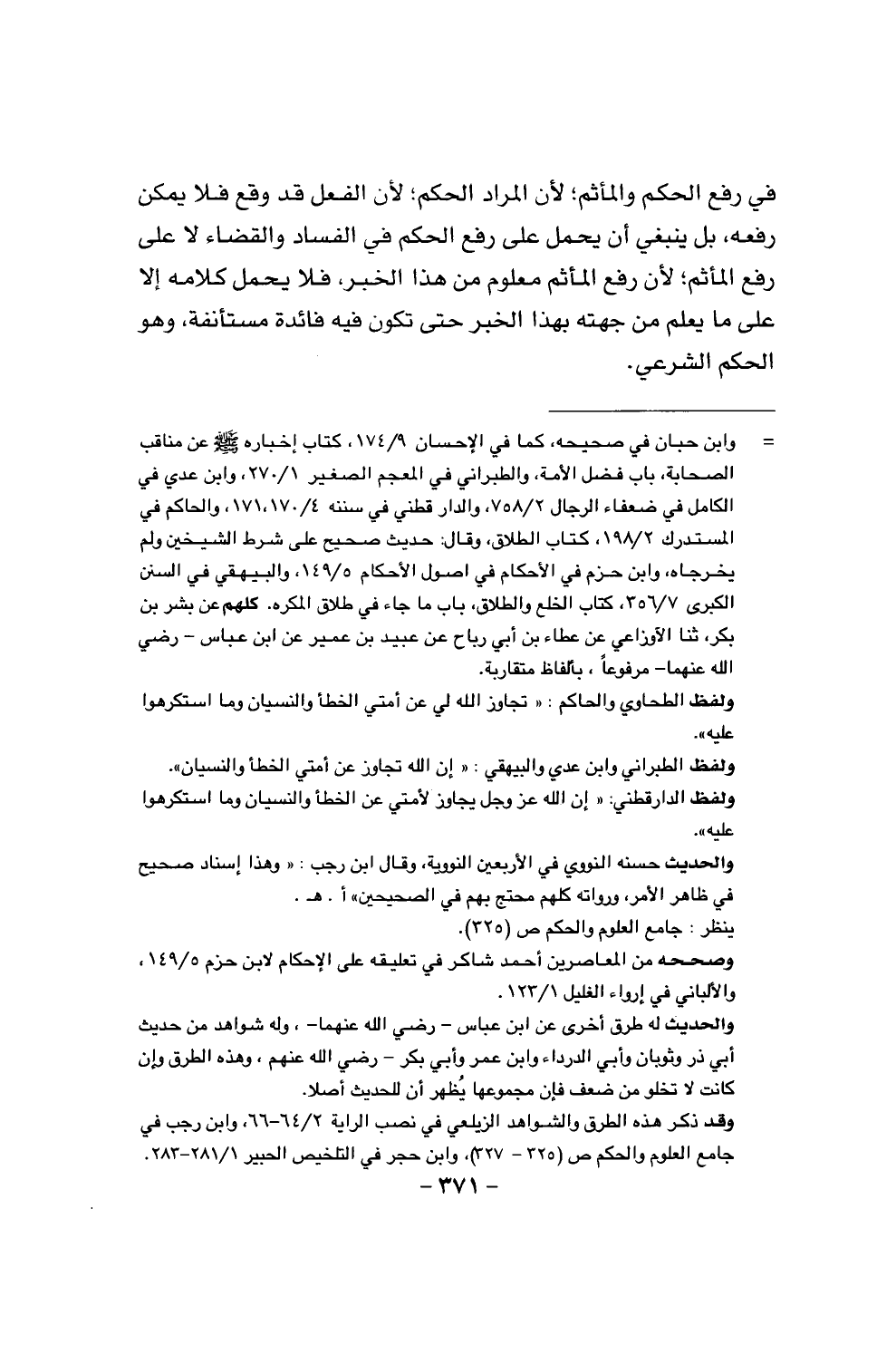 في رفع الحكم والمأثم؛ لأنَّ المراد الحكم؛ لأن الفعل قد وقع فلا يمكن رفعه، بل ينبغي أن يحمل على رفع الحكم في الفساد والقضاء لا على رفع المأثم؛ لأن رفع المأثم معلوم من هذا الخبر، فلا يحمل كلامه إلا على ما يعلم من جهته بهذا الخبر حتى تكون فيه فائدة مستأنفة، وهو الحكم الشرعي.