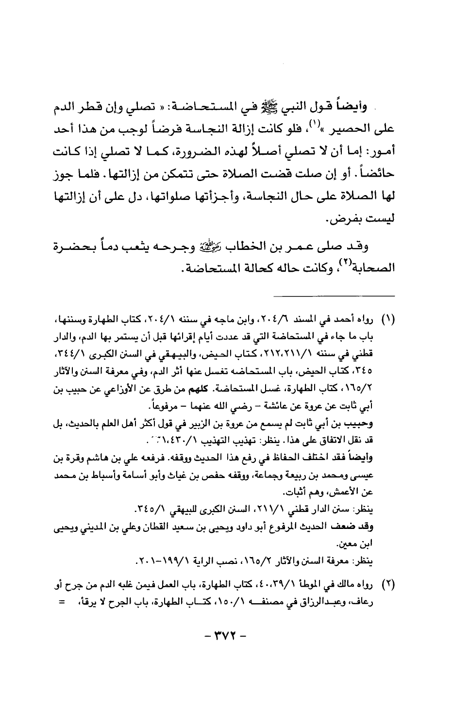 وقد صلى عمر بن الخطاب رضي الله عنه وجرحه يثعب دماً بحضرة الصحابة، وكانت حاله كحالة المستحاضة.