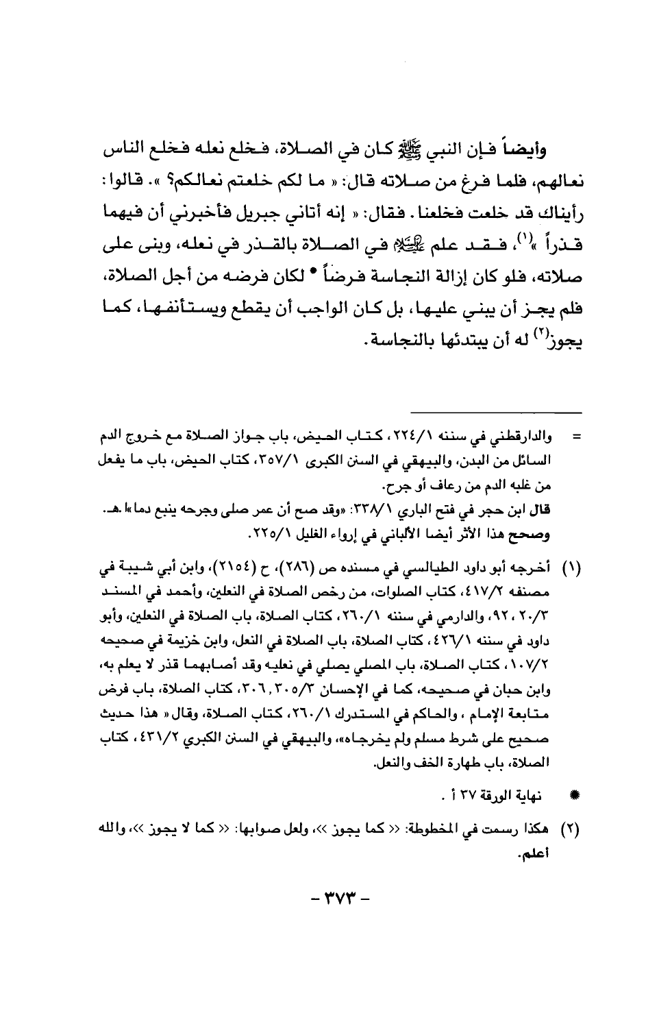 وأيضاً فإن النبي صَلَّى اللَّهُ عَلَيْهِ وَسَلَّمَ كان في الصلاة، فخلع نعله فخلع الناس نعالهم، فلمَّا فرغ من صلاته قلا: «ما لكم خلعتم نعالكم؟»، قالوا: رأيناك قد خلعت فخلعنا. فقال: «إنه أتاني جبريل فأخبرني أن فيهما قذراً»، فقد علم عليه السلام في الصلاة بالقذر في نعله، وبنى على صلاته، فلو كان إزالة النجاسة فرضاً، لكان فرضه من أجل الصلاة، فلم يجز أن يبني عليها، بل كان الواجب أني قطع ويستأنفها، كما يجوز له أن يبتدئها بالنجاسة.