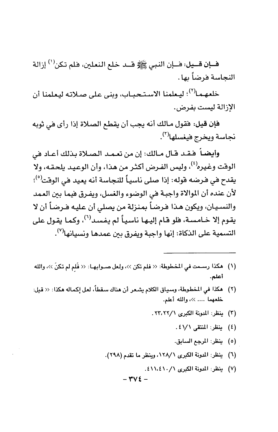 وأيضاً فقد قال مالك: إن من تعمد الصلاة بذلك أعاد في الوقت وغيره، وليس الفرض أكثر من هذا، وان الوعيد يلحقه، ولا يقدح في فرضه قوله: إذا صلَّى ناسياً لنجاسة أنه يعيد في الوقت؛ لأن عنده أن الموالاة واجبة في الوضوء والغسل، ويفرق فيما بين العمد والنسيان، ويكون هذا فرضاً بمنزلة من يصلي أن عليه فرضاً أن أل ي قوم إلا خامسة، فلو قام إليها ناسياً لم يفسد، وكنا يقول على التسمية على الذكاة، إنها واجبة يفرق بين عمدها ونسيانها.