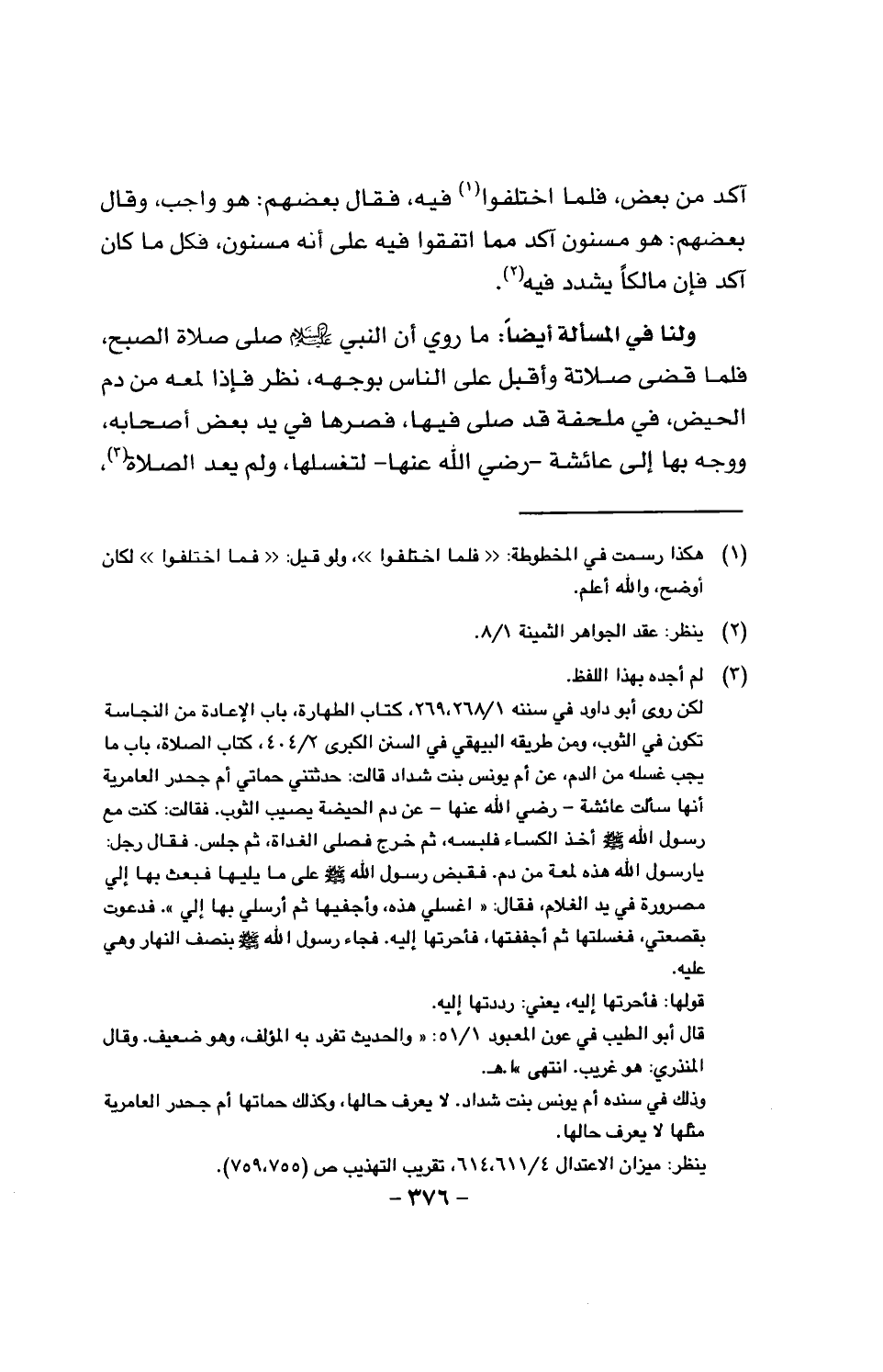 ولنا في المسألة أيضاً: ما روي أن النبي عليه السلام صلى صلاة الصبح، فلمَّا قضى صلاته واقبل على الناس بوجهه، نظر فإذا لمعه من دم الحيض، في ملحفة قد صلَّى فيها، فصرها في يد بعض أصحابه، ووجه بها عائشة -رضي الله عنها - لتغسلها، ولم يعد الصداة،