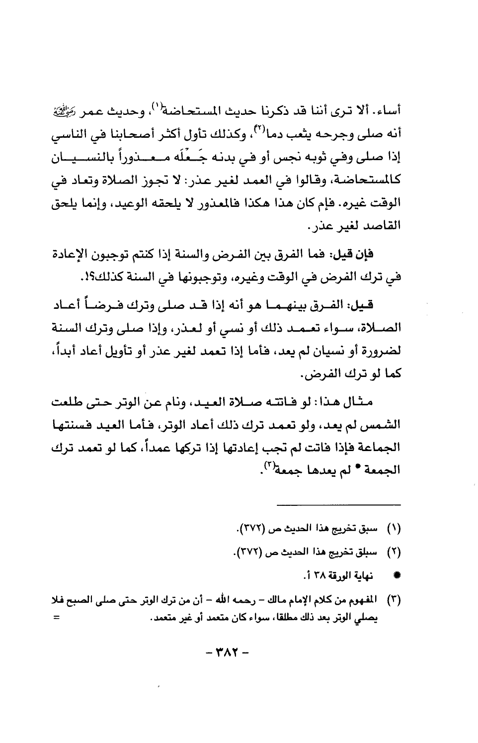 أساء، ألا ترى أننا قدذ كرنا حديث المستحاضة، وحديث عمر رضي الله عنه أنَّه صلَّى وجرحه يثعب دماً، وكذلك تأول أكثر أصحابنا في الناسي إذا صلَّى وفي ثوبه نجس أو في بدنه جَعْلَه معذوراً بالنسيان كالمستحاضة، وقالوا في العمد لغير عذر، لا تجوز الصلاة وتعاد في الوقت غيره، فإن كان هذا هكذا فالمعذور لا يلحقه الوعيد، وإنما يلحق القاصد لغير عذر.