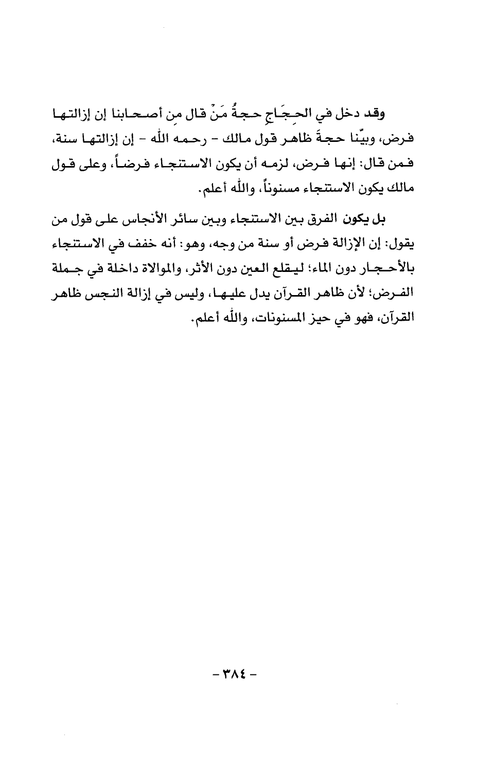 وقد دخل في الحِجَاجِ حجةُ مَنْ قال مِن أصحابنا: إن إزالتها فرض، وبيّنا حجةَ ظاهر قول مالك -رَحمَه الله - إن إزالتها سنة، فمن قال: إنها فرض، لزمه أن يكون الاستنجاء فرضاً، وعلى قول مالك يكون الاستنجاء مسنوناً، والله أعلم.