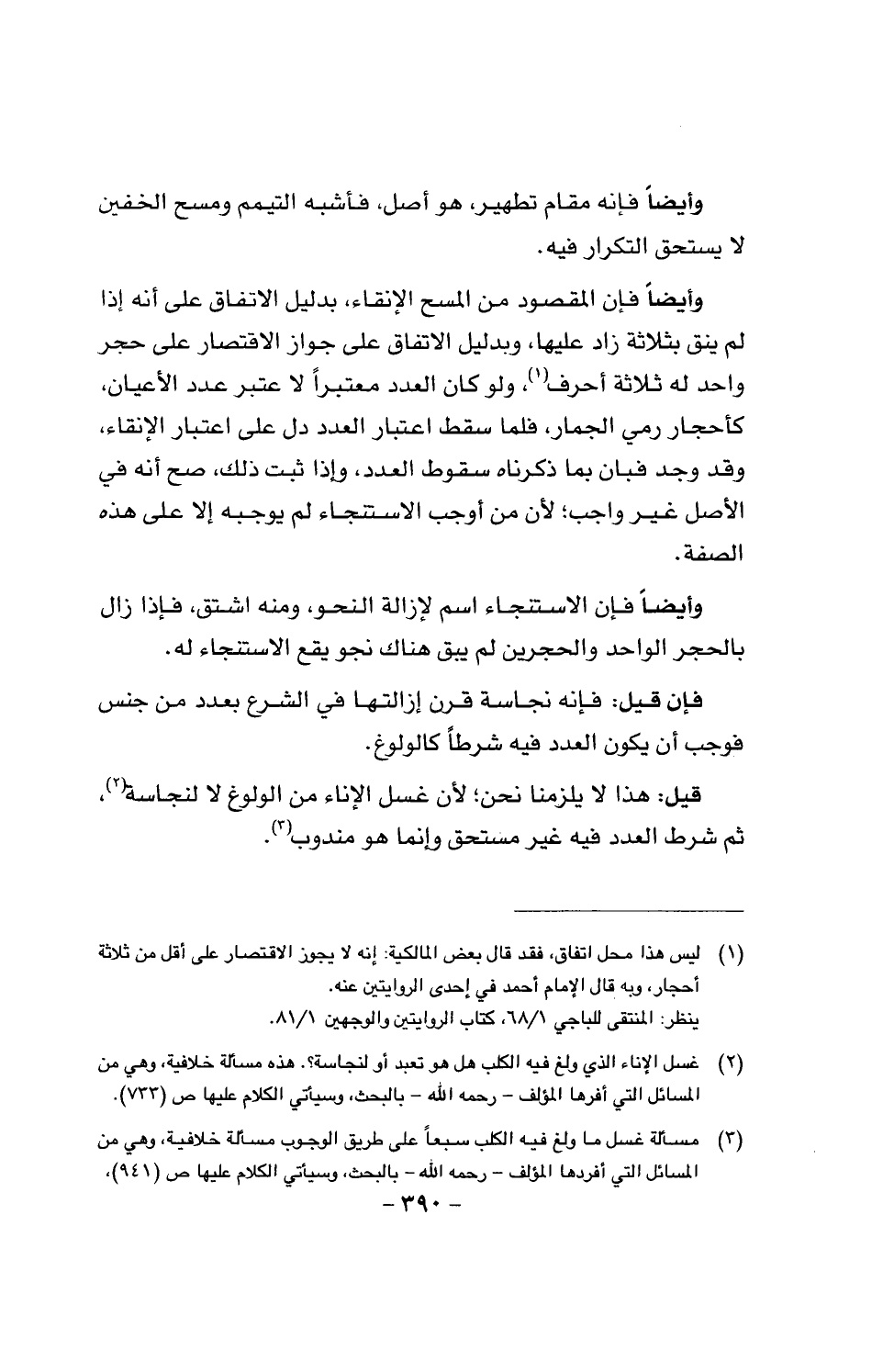وأيضاً فإن المقصود من المسح الإنقاء، بدليل الاتفاق على أنَّه إذا لم ينق بثلاثة زاد عليها، وبدليل الاتفاق على جواز الاقتصار على حجر واحد له ثلاثة أحرف، ولو كان العدد معتبراً لاعتبر عدد الأعيان، كأحجار رمي الجمار، فلمَّا سقط اعتبار العدد دل على اعتبار الإنقاء، وقد وجد فبان بما ذكرناه سقوط العدد، وإذا ثبت ذلك، صح أنه في الأصل غير واجب؛ لأن من أوجب الاستنجاء لم يوجبه إلا على هذه الصفة.