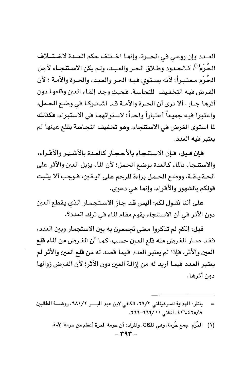 العدد وإن روعي في الحرة، وإنما اختلف حكم العدة لاختلاف الحُر! م كالحدود وطلاق الحر والعبد، ولم يكن الاستنجاء لأجل الحُرَم معتبراً؛ لأنَّه يستوي فيه الحر والعبد، والحرة والأمر، لأن الفرض فيه التخفيف للنجاسة فحيث وجد إلقاء العين وقلعها دون أثرها جاز، ألا ترى أن الحرة والأمة قد اشتركا يف وضع الحمل، واعتبرا فيه جميعاً اعتباراً واحداً؛ لاستوائهما في الاستبراء، فكذلك لما استوى الفرض في الاستنجاء وهو خفيف النجاسة بقلع عينها لم يعتبر فيه العدد.