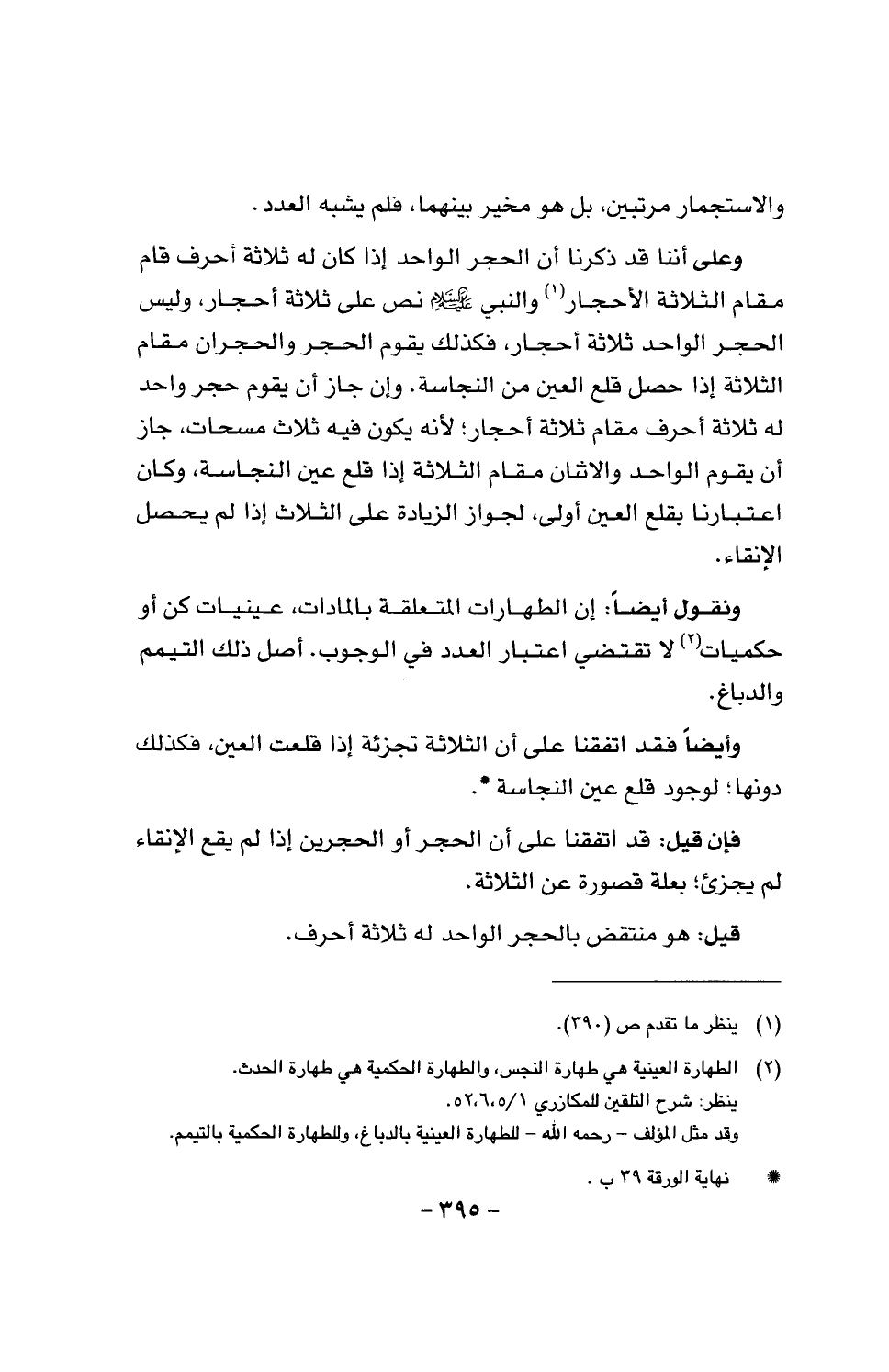 وعلى إننا قد ذكرنا أن الحجر الواحد إذا كان له ثلاثة أحرف قام مقام الثلاثة الأحجار والنبي عليه السلام نص على ثلاثة أحجار، وليس الحجر الواحد ثلاثة أحجار، فكذلك يقوم الحجر والحجران، وليس الثلاثة إذا حصل قلع العين من النجاسة، وإن جاز أن يقوم حجر واحد له ثلاثة أحرف مقام ثلاثة أحجار؛ لأنه يكون فيه ثلاث مسحات، جاز أني قوم الواحد والاثنان مقام الثلاثة إذا قلع عين النجاسة، وكان اعتبارنا بقلع العين أولى، لجواز الزيادة على الثلاث إذا لم يحصل الإنقاء.