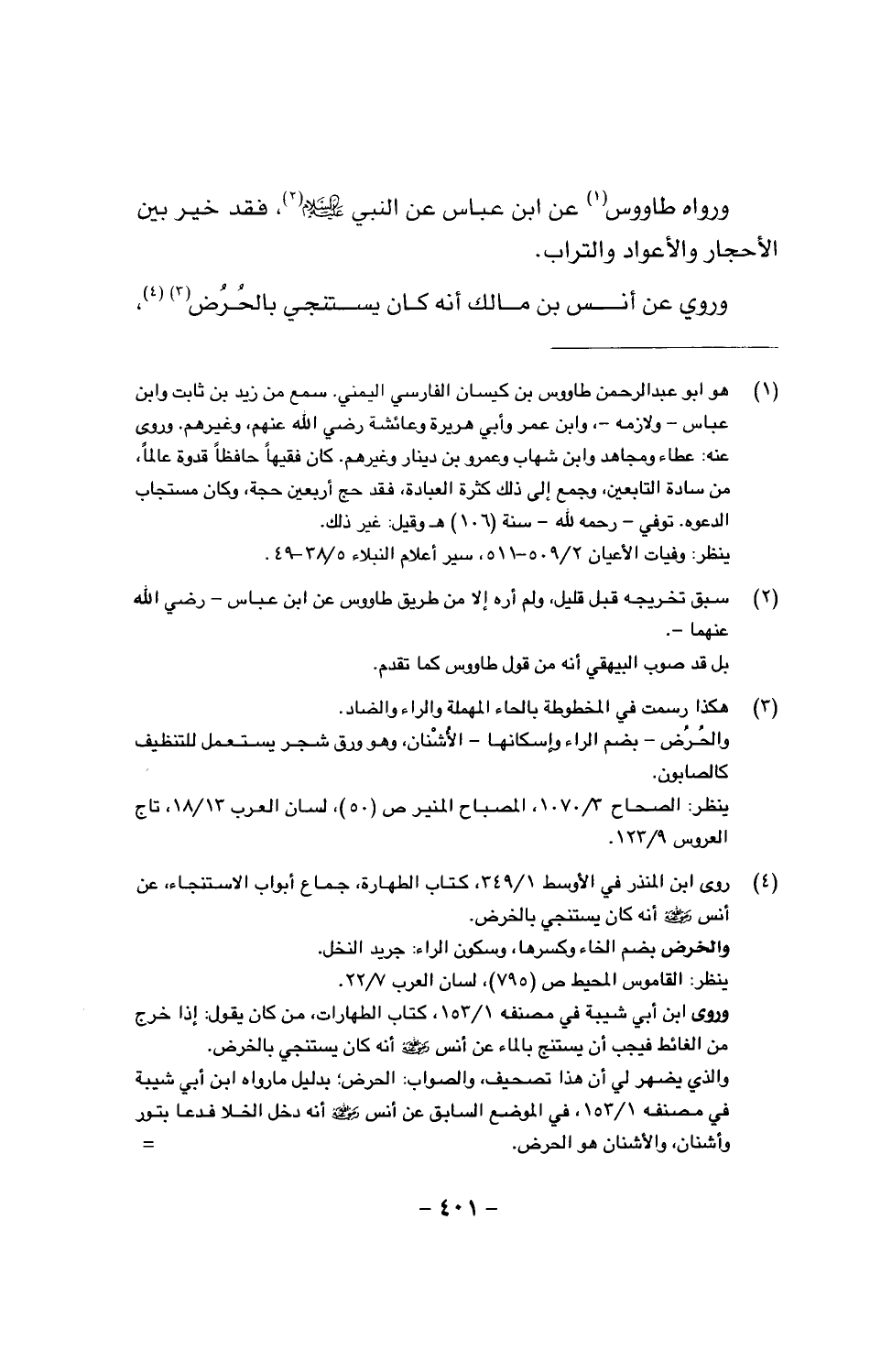 ورواه طاووس عن ابن عباس عن النبي صَلَّى اللَّهُ عَلَيْهِ وَسَلَّمَ فقد خيِّر بين الأحجار والأعواد والتراب.