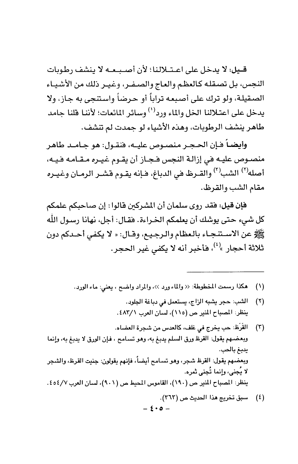 قيل: لا يدخل على اعتلالنا؛ لأن أصبعه لا ينشف رطوبات النجس، بل تصقع كالعظم والعاج والصفر، وغير ذلك من الأشياء الصقيلة، ولو ترك على أصبعه تراباً أو حرضاً واستنجى به جاز، ولا يدخل على اعتلالنا الخل والماء ورد وسائر المائعات؛ لأننا قلنا جامد طاهر ينشف الرطوبات، وهذه الأشياء لو جمدت لم تنشف.