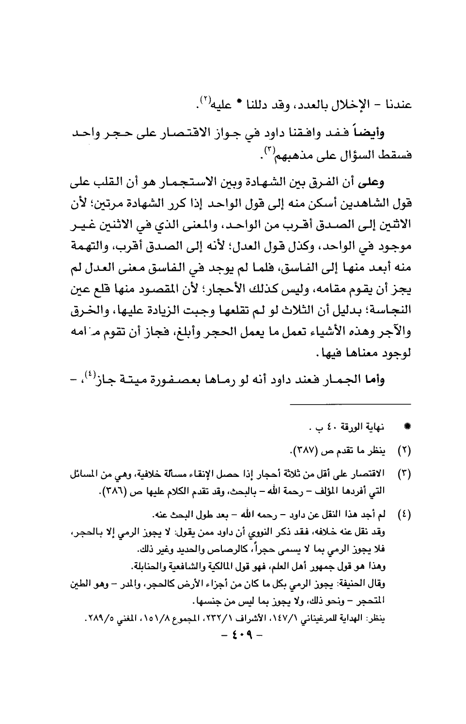 وأيضاً فقد وافقنا داود في جواز الاقتصار على حجر واحد فسقط السؤال على مذهبهم.