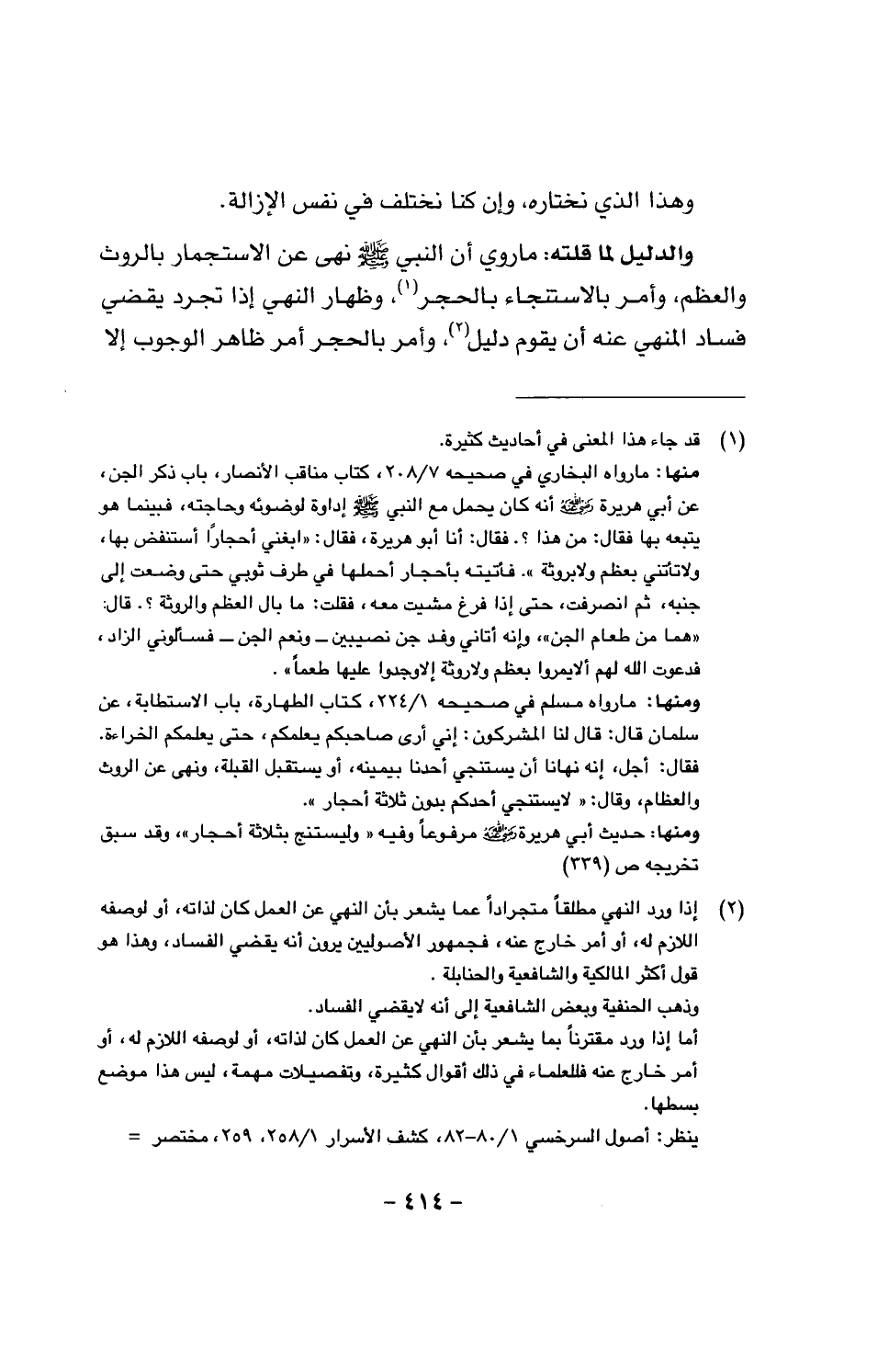 والدليل لما قلناه: ما رُوِيَ أن النبي نهى عن الاستجمار بالروث والعظم، وأمر الاستنجاء بالحجر، وظهار النهي إذا تجرد يقضي فساد المنهي عنه أن يقوم دليل، وأمر بالحجر أمر ظاهر الوجوب إلاَّ