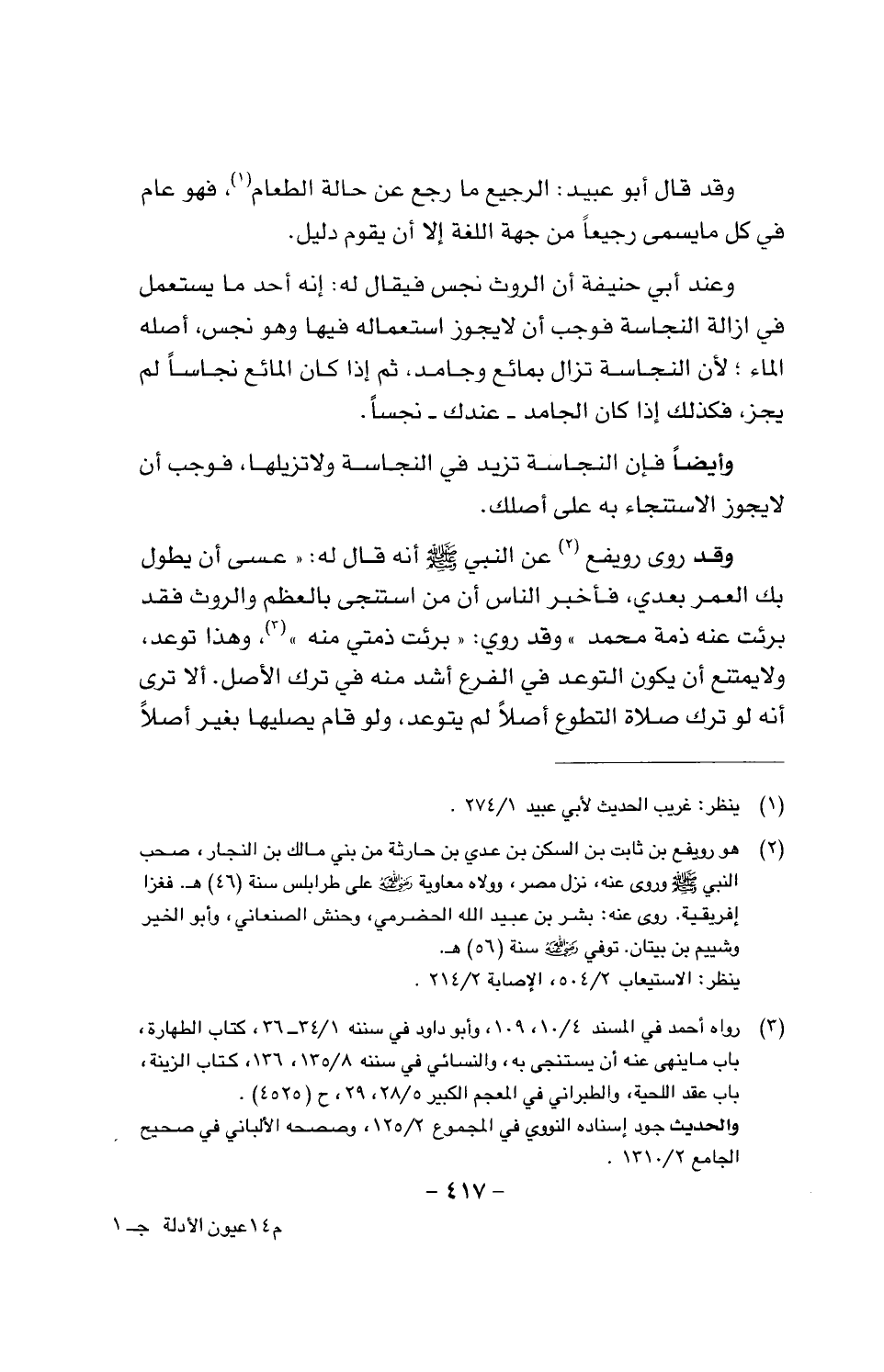 وقد روى رويفع عن النبي أنه قال له: «عسى أن يطول بك العمر بعدي، فأخبر الناس أن من استنجى بالعظم والروث فقد برئت عنه ذمة محمد»، وقد رُوِيَ: «برئت ذمتي منه»، وهذا توعد، ولا يمتنع أن يكون التوعد في الفرع أشد منه في ترك الأصل، ألا ترى أنه لو ترك صلاة التطوع أصلاً لم يتوعد، ولو قام يصليها بغير أصلاً