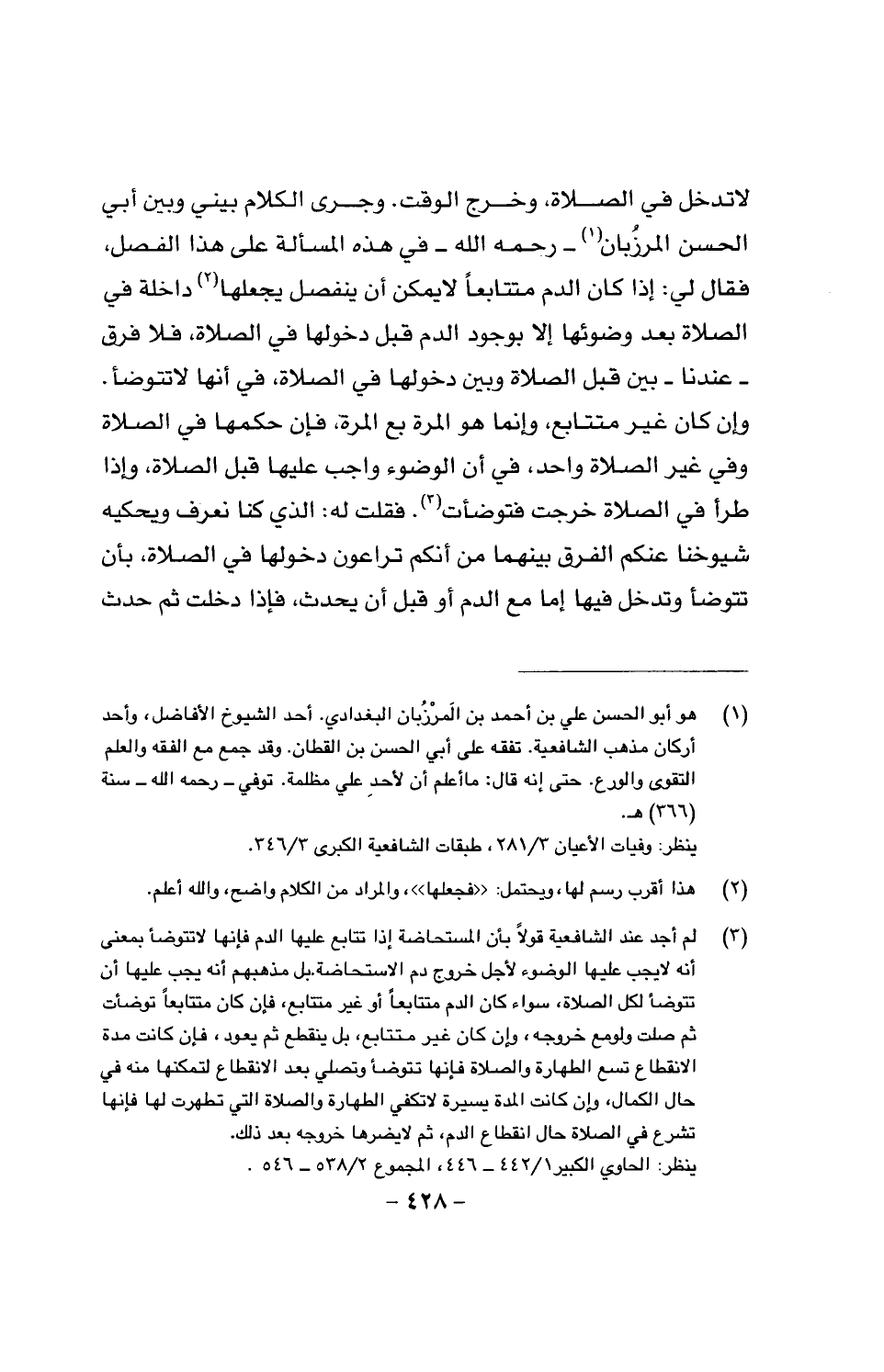 لا تدخل في الصلاة، وخرج الوقت. وجرى الكلام بيني وبين أبي الحسن المرزبان - رَحمَه الله - في هذه المسالة على هذا الفصل، فقال لي: إذا كان الم متتابعاً لا يمكن أن ينفصل يجعلها داخلة في الصلاة، بعد وضوئها إلاَّ بوجود الدم قبل دخولها في الصلاة، فلا فرق - عندنا - بين قبل الصلاة، وبين دخولها في الصلاة، في أنها لا تتوضأ.