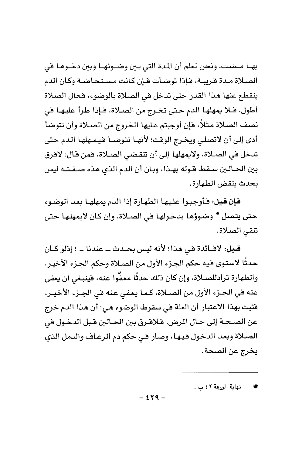 بها مضت، ونحن نعلم أن المدة التي بين وضوئها وبين دخولها في الصلاة مدة قريبة، فإذا توضأت فإن كانت مستحاضة وكان الدم ينقطع عنها هاذ القدر حتى تدخل في الصالة بالوضوء، فحال الصلاة أطول، فلا يمهلها الدم حتى تخرج من الصلاة، فإذا طرأ عليها في نصف الصلاة، فإن أوجبتم عليها الخروج من الصلاة وأن تتوضأ أدى إلى أن تُصَلِّي ويخرج الوقت؛ لأنها تتوضأ فيمهلها الدم حتى تدخل في الصلاة، ولا يمهلها إلى أن تنقضي الصلاة، فمن قال: لا فرق بين الحالين سقط قوله بها، وبان أن الدم الذي هذه صفته ليس بحدث ينقض الطهارة.