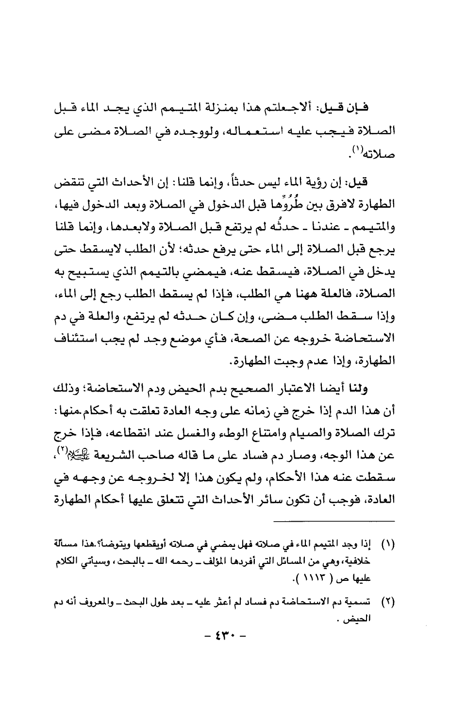قيل: إن روية الماء ليس حدثاً، وإنما قلنا: إن الأحداث التي تنقض الطهارة لا فرق بين طُرُوِّها قبل الدخول في الصلاة وبعد الدخول فيها، والمتيمم - عندنا - حدثُه لم يرتفع قبل الصلاة ولا بعدها، وإنما قلنا يرجع قبل الصلاة إلى الماء حتى يرفع حدثه؛ لأن الطلب لا يسقط حتى يدخل في الصلاة، فيسقط عنه، فيمضي بالتيمم الذي يستبيح به الصلاة، فالعلة ههنا هي الطلب، فإذا لم يسقط الطلب رجع إلى الماء، وإذا سقط الطلب مضى، وإن كان حدثه لم يرتفع، والعلة في دم الاستحاضة خروجه عن الصحة، فأي موضع وجد لم يجب استئناف الطهارة، وإذا عدم وجبت الطهارة.