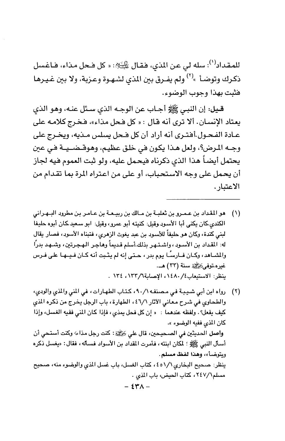قيل: إن النبي صَلَّى اللَّهُ عَلَيْهِ وَسَلَّمَ أجاب عن الوجه الذي سئل عنه، وهو الذي يعتاد الإنسان، ألا ترى أنه قال: «كل فحل مذاء»، فخرج كلامه على عادة الفحول. أفترى أنه أراد أن كل فحل يسلس مذية، ويخرج على وجه المرض؟ ولعل هذا يكون في خلق عظيم، وهو قضية في عين يحتمل أيضاً هاذ الذي ذكرناه فيحمل عليه، ولو ثبت العموم فيه لجاز أن يحمل على وجه الاستحباب، أو على من اعتراه المرة بما تقدام من الاعتبار.