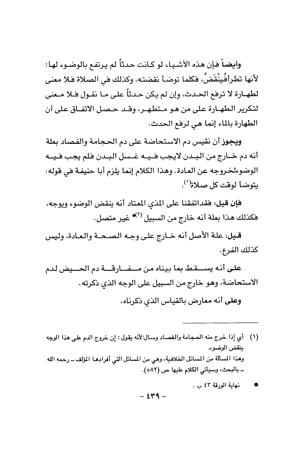 ويجوز أن نقيس دم الاستحاضة على دم الحجامة والفصاد بعلة أنه دم خارج من البدن لا يجب فيه غسل البدن فلم يجب فيه الوضوء لخروجه عنه العادة. وهذا الكلام إنما يلزم أبا حنيفة في قوله: يتوضأ لوقت كل صلاة.
