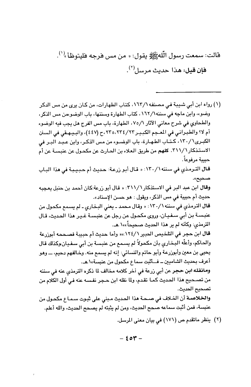 قالت: سمعت رسول الله صَلَّى اللَّهُ عَلَيْهِ وَسَلَّمَ يقول: «من مس فرجه فليتوضأ».