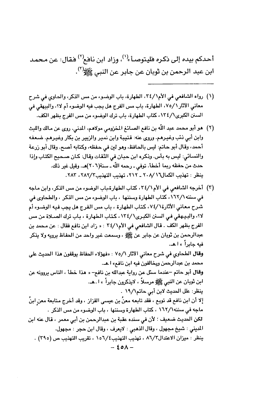 أحدكم بيده إلى ذكره فليتوضأ». وزاد ابن نافع فقال: عن محمد بن عبد الرحمن بن ثوبان عن جابر عن النبي صَلَّى اللَّهُ عَلَيْهِ وَسَلَّمَ.