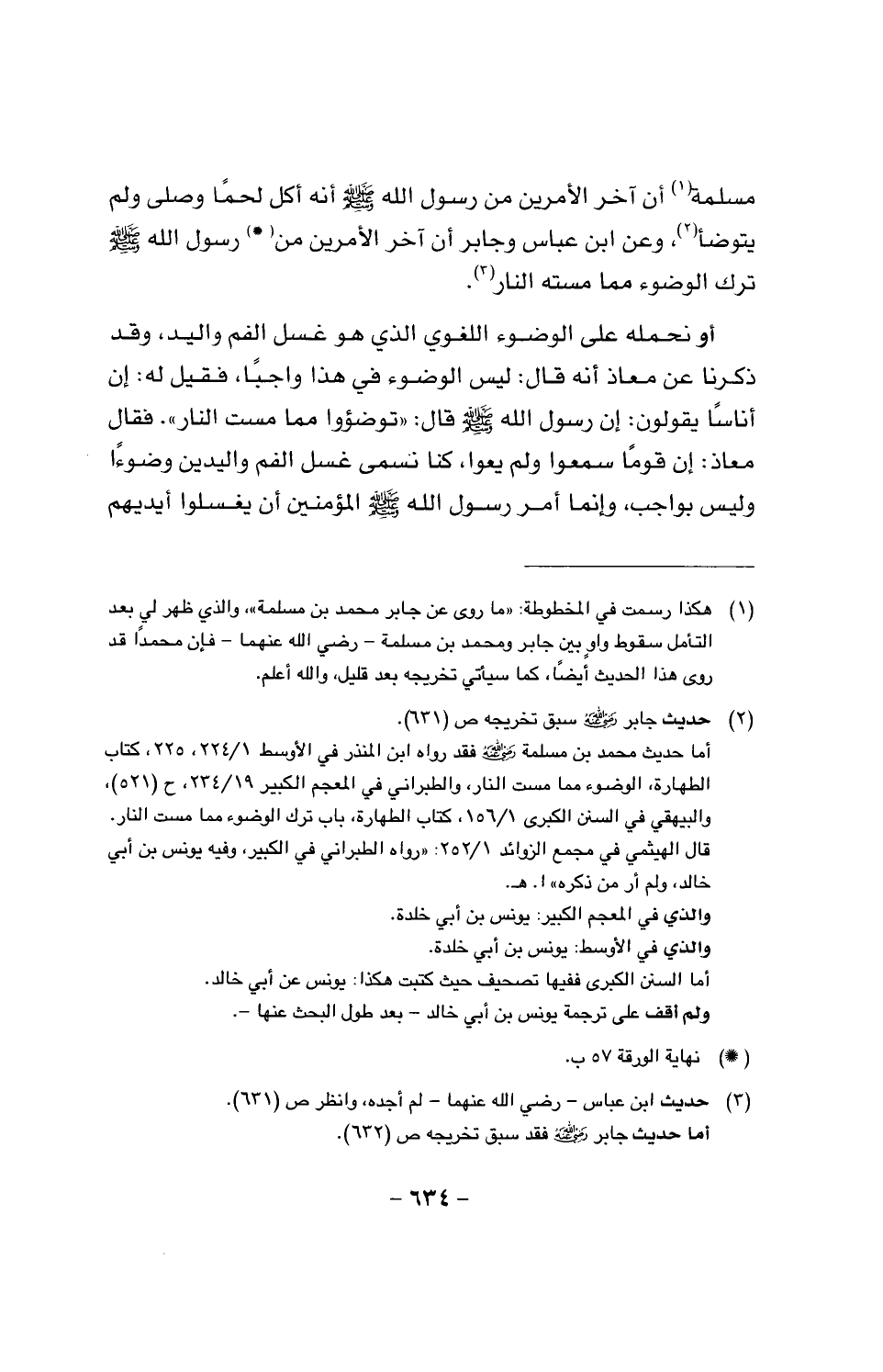 مسلمة أن آخر الأمرين من رسول الله صَلَّى اللَّهُ عَلَيْهِ وَسَلَّمَ أنه أكل لحما وصلى ولم يتوضأ، وعن ابن عباس وجابر أن آخر الأمرين من رسول الله صَلَّى اللَّهُ عَلَيْهِ وَسَلَّمَ ترك الوضوء مما مسته النار.