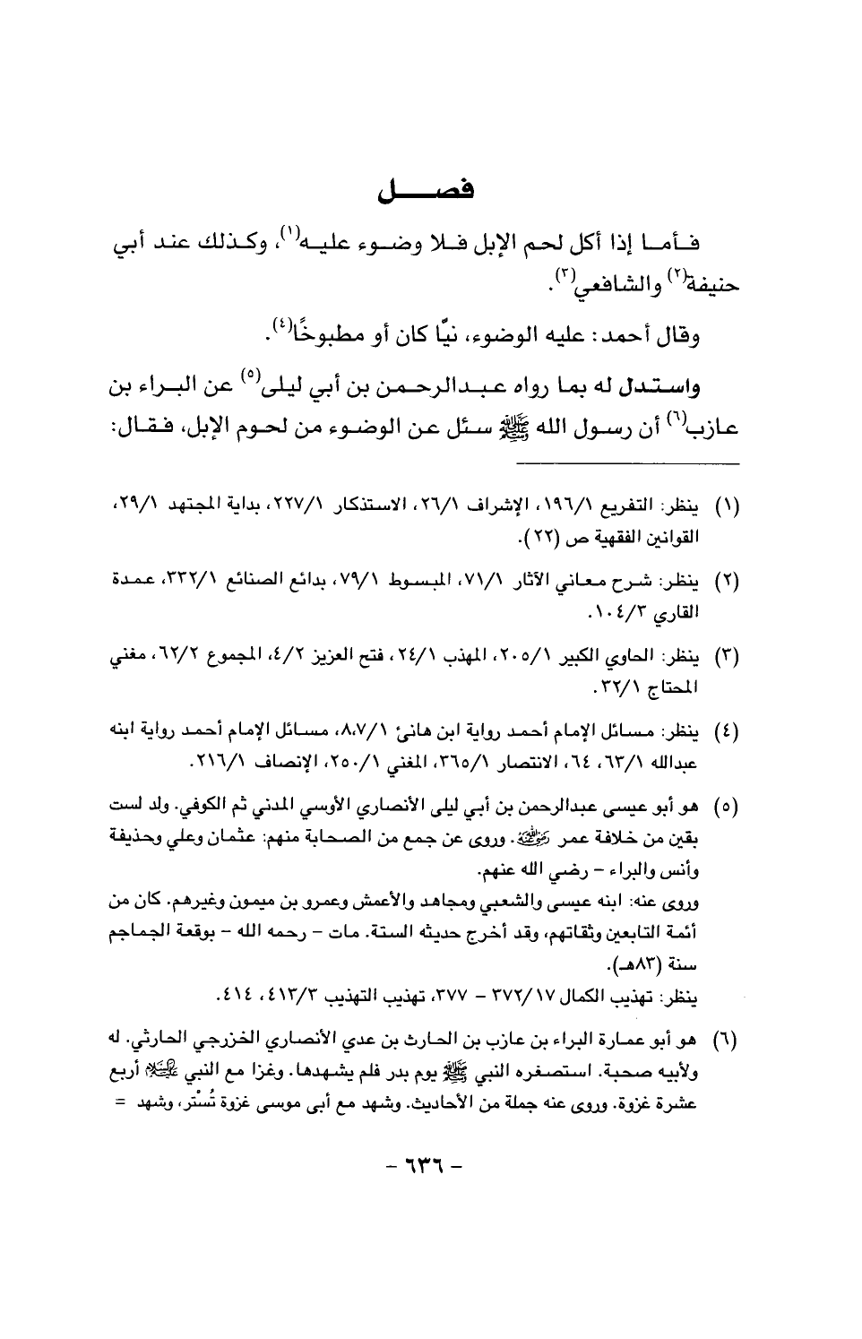 واستدل له بما رواه عبد الرحمن بن أبي ليلى عن البراء بن عازب أن رسول الله صَلَّى اللَّهُ عَلَيْهِ وَسَلَّمَ سئل عن الوضوء من لحوم الإبل، فقال