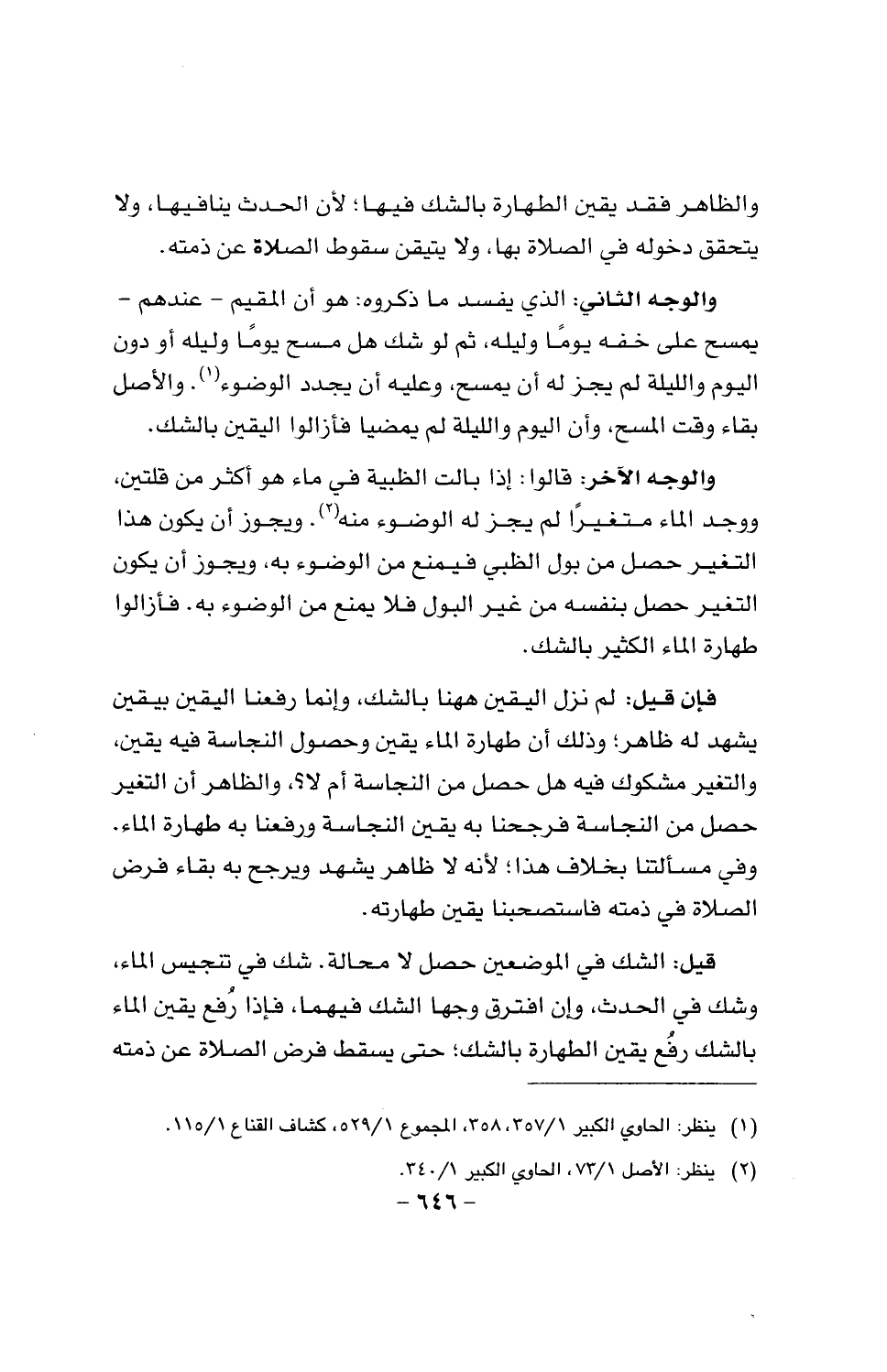 والوجه الآخر: قالوا: إذا بالت الظبية في ماء هو أكثر من قلتين ووجد الماء متغيرا لم يجز له الوضوء منه. ويجوز أن يكون هذا التغير حصل من بول الظبي فيمنع من الوضوء به، ويجوز أن يكون التغير حصل بنفسه من غير البول فلا يمنع من الوضوء به. فأزالوا طهارة الماء الكثير بالشك.