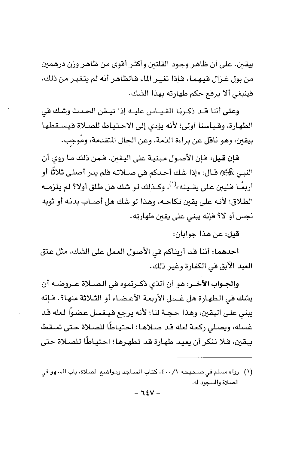 والجواب الآخر: هو أن الذي ذكرتموه في الصلاة عروضه أن يشك في الطهارة هل غسل الأربعة الأعضاء أو الثلاثة منها؟. فإنه يبني على اليقين، وهذا حجة لنا؛ لأنه يرجه فيغسل عضوا لعله قد غسله، ويصلي ركعة لعله قد صلاها؛ احتياطا للصلاة حتى تسقط بيقين، فلا ننكر أن يعيد طهارة قد تطهرها؛ احتياطا للصلاة حتى تسقط عنه بيقين.