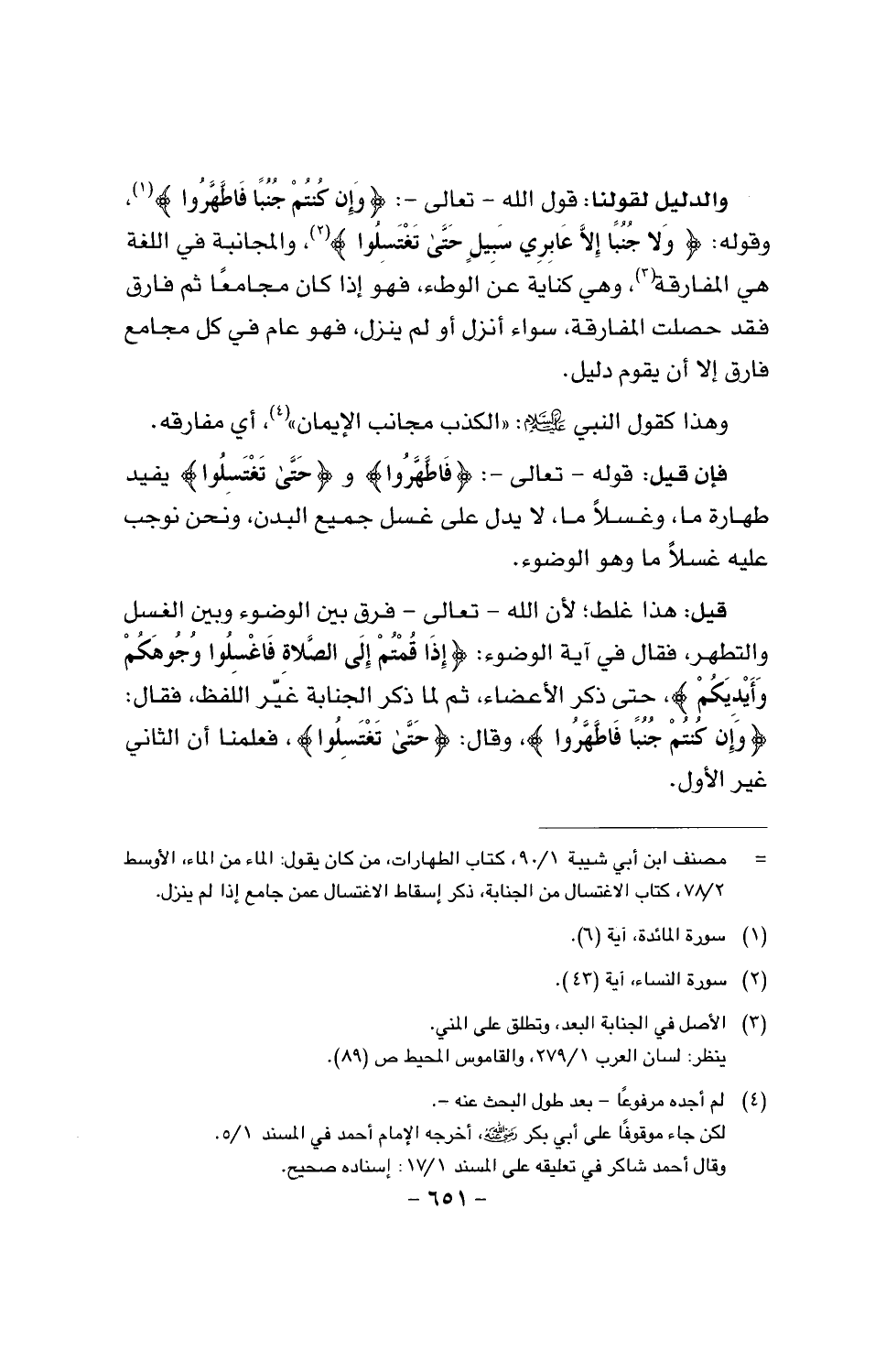 والدليل لقولنا: قول الله - تعالى -: {وإن كنتم جنبا فاطهروا}، وقوله: {ولا جنبا إلا عابري سبيل حتى تغتسلوا}، والمجانبة في اللغة هي المفارقة، وهي كناية عن الوطء، فهو إذا كان مجامعا ثم فارق فقد حصلت المفارقة، سواء أنزل أو لم ينزل، فهو عام في كل مجامع فارق إلا أن يقوم دليل.