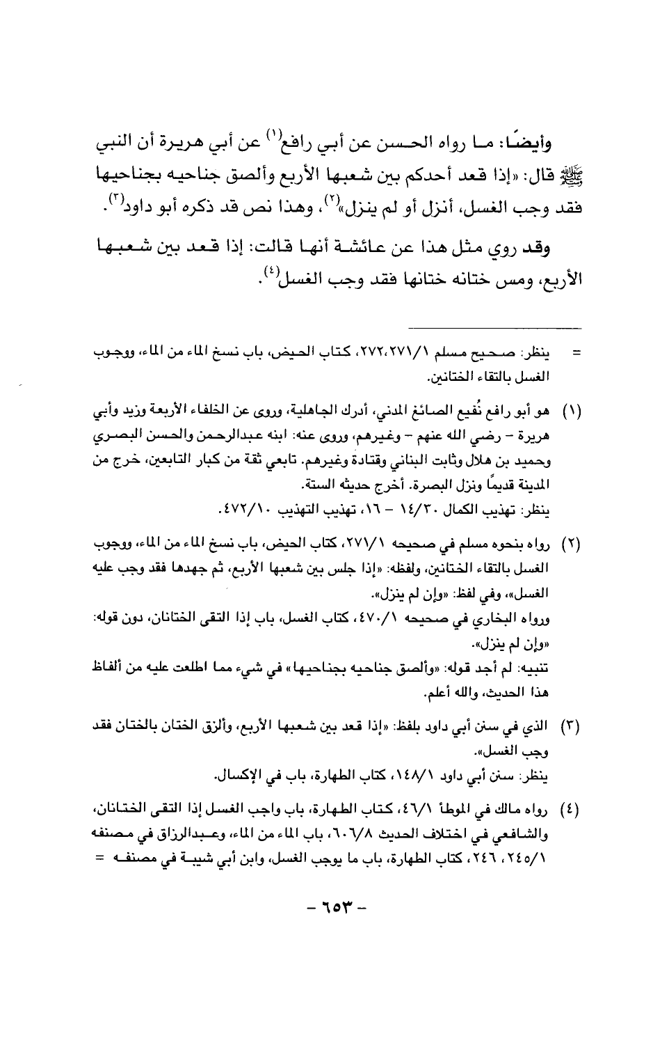 وأيضا: ما رواه الحسن عن أبي رافع عن أبي هريرة أن النبي صَلَّى اللَّهُ عَلَيْهِ وَسَلَّمَ قال: (إذا قعد أحدكم بين شعبها الأربع وألصق جناحيه بجناحيها فقد وجب الغسل، وأنزل أو لم ينزل)، وهذا نص قد ذكره أبو داود.