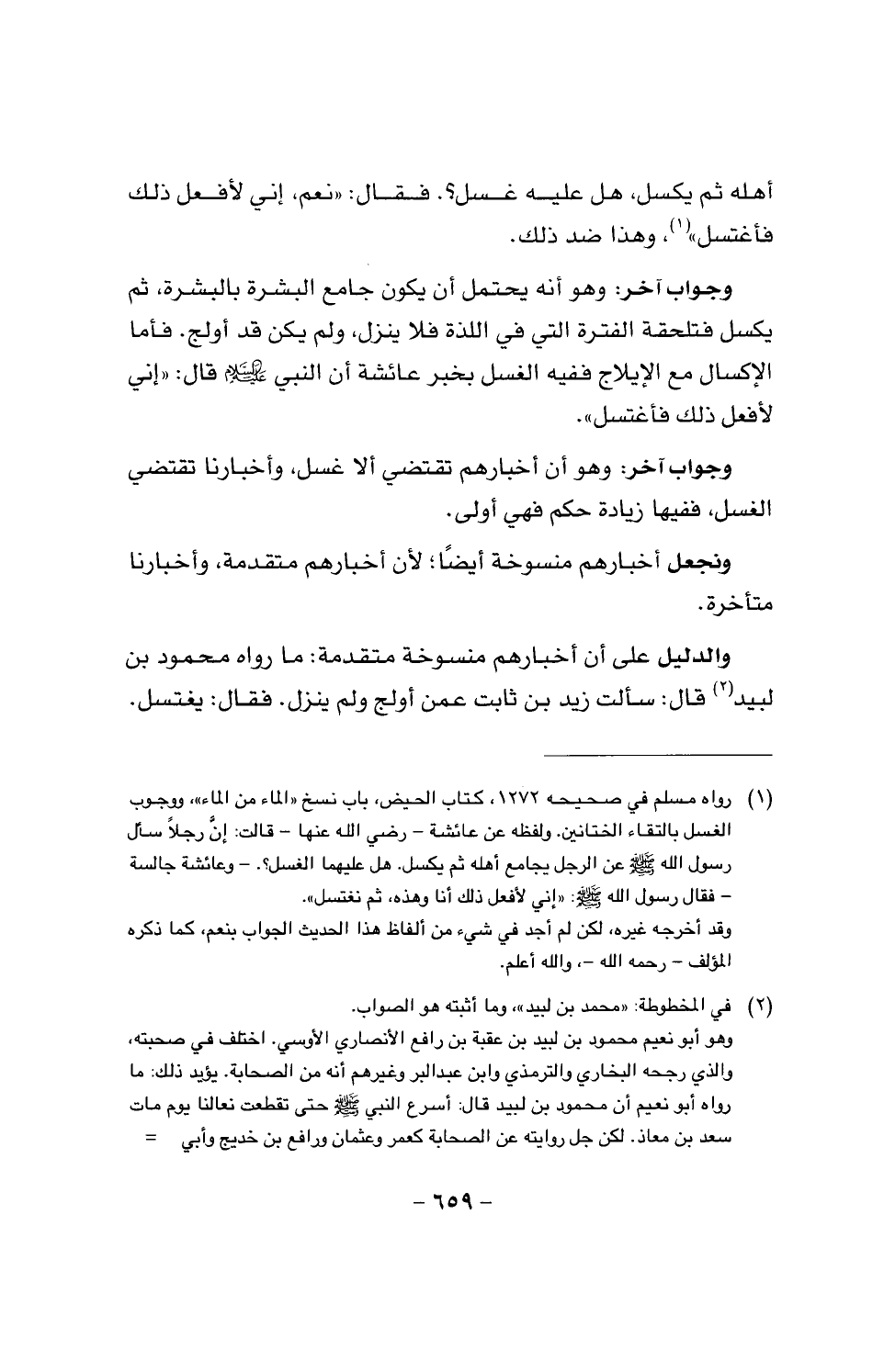 والدليل على أن أخبارهم منسوخة متقدمة: ما رواه محمود بن لبيد قال: سألت زيد بن ثابت عمن أولج ولم ينزل. فقال: يغتسل.