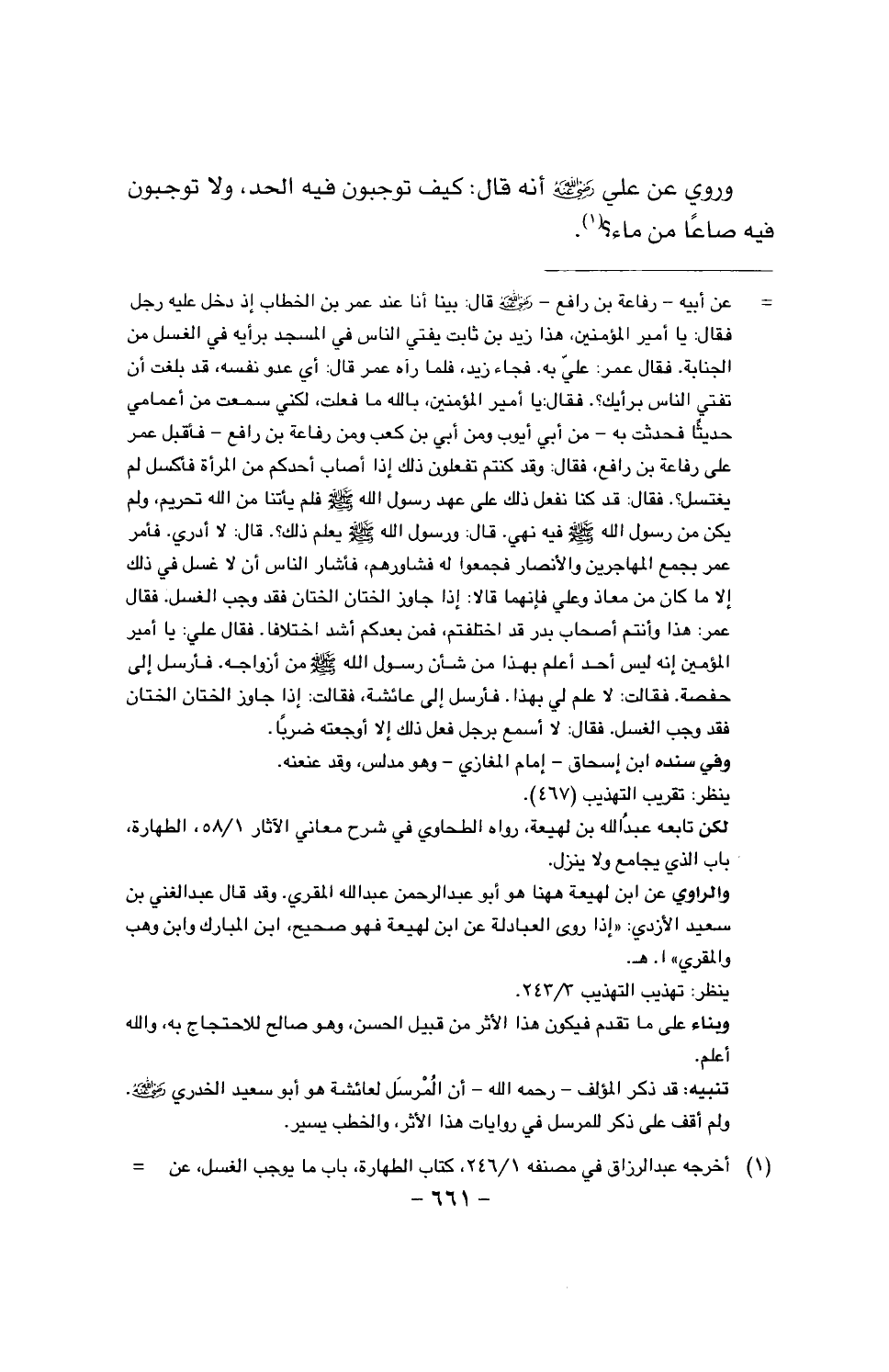 وروي عن علي رضي الله عنه أنه قال: كيف توجبون فيه الحد، ولا توجبون فيه صاعا من ماء؟.