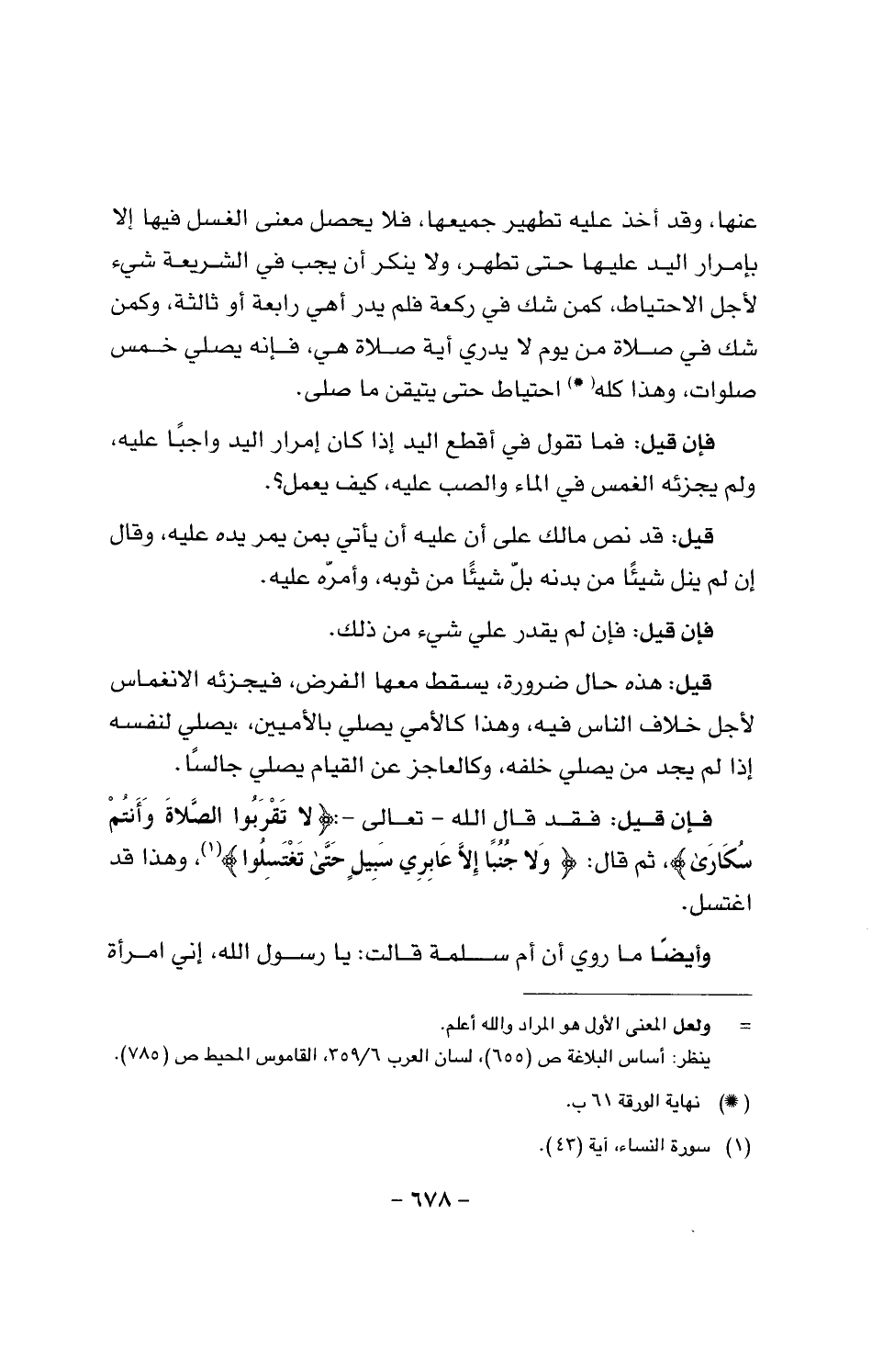 عنها، وقد أخذ عليه تطهير جميعها، فلا يحصل معنى الغسل فيها إلا بإمرار اليد عليها حتى تطهر، ولا ينكر أن يجب في الشريعة شيء لأجل الاحتياط، كمن شك في ركعة فلم يدر أهي رابعة أو ثالثة، كمن شك في صلاة من يوم لا يدري أية صلاة هي، فإنه يصلي خمس صلوات، وهذا كله احتياط حتى يتيقن ما صلى.