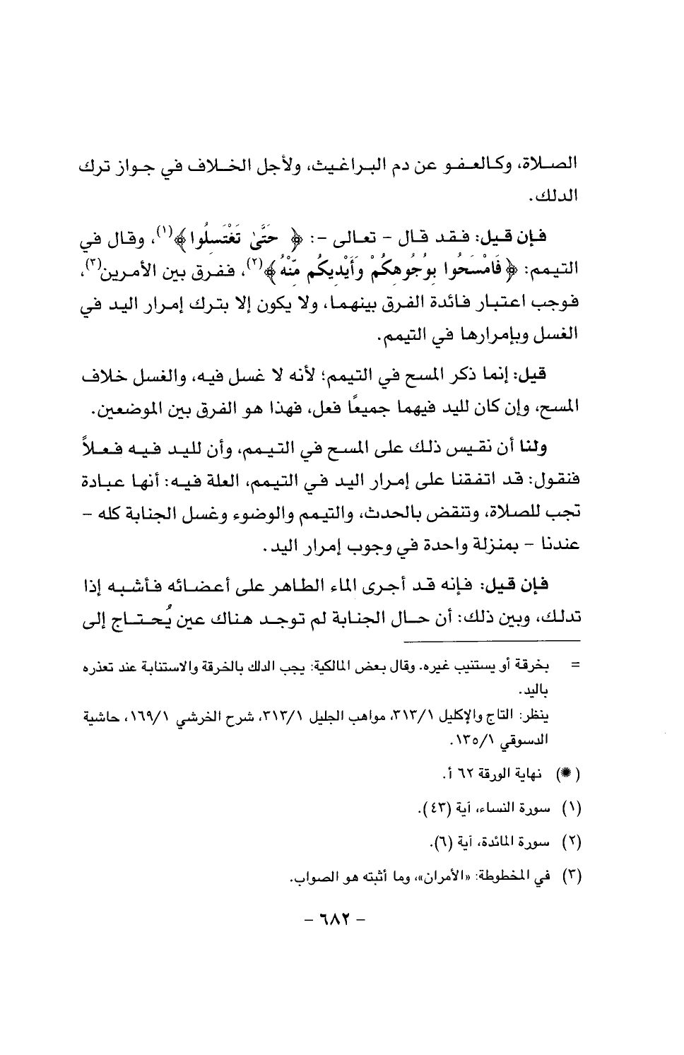 ولنا أن نقيس ذلك على المسح في التيمم، وأن لليد فيه فعلا فنقول: قد اتقنا على إمرار اليد في التيمم، العلة فيه: أنها عبادة تجب للصلاة، وتنقض بالحدث، والتيمم والوضوء وغسل الجنابة كله - عندنا - بمنزلة واحدة في وجوب إمرار اليد.