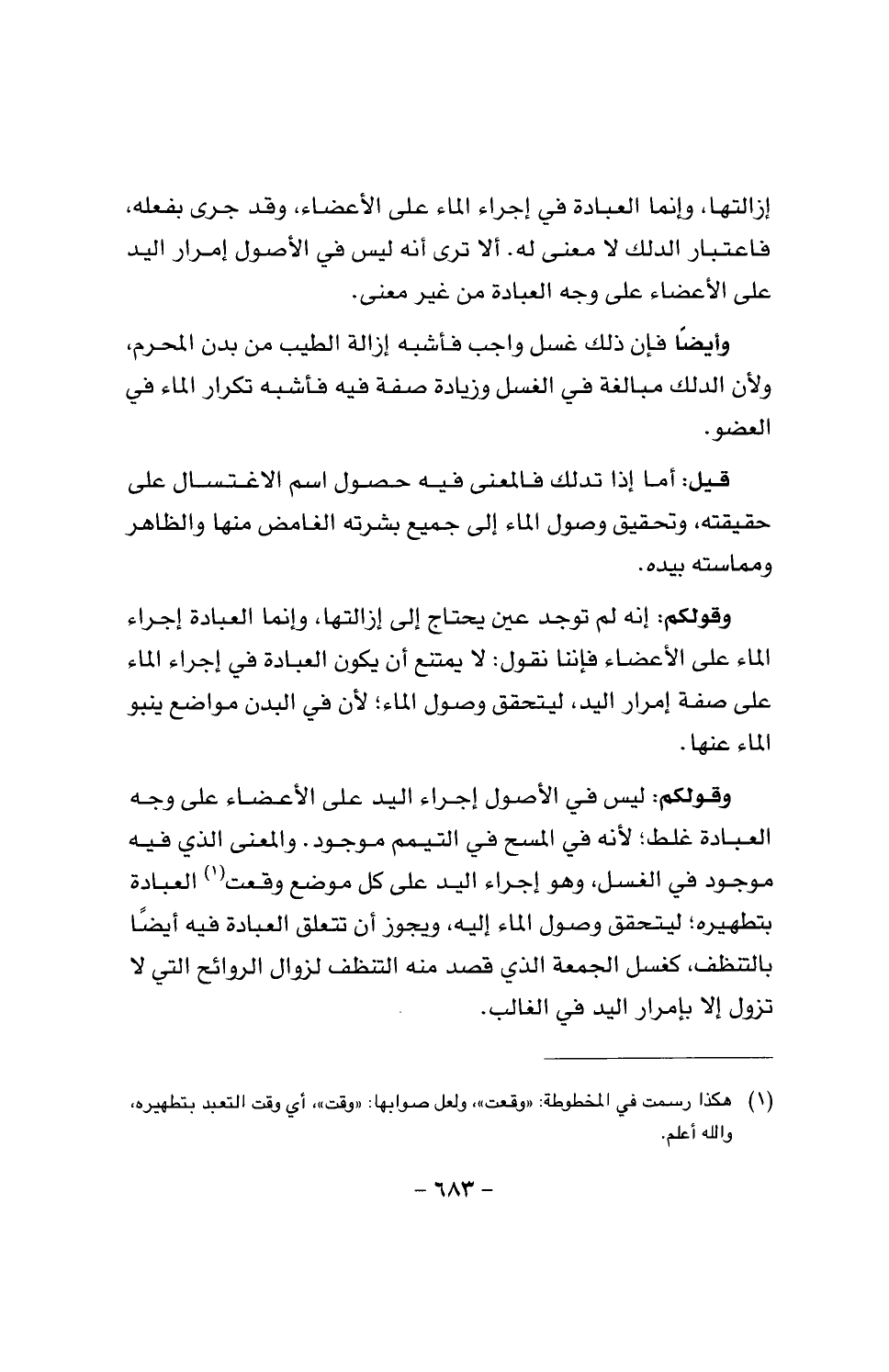 وقولكم: إنه لم توجد عين يحتاج إلى إزالتها، وإنما العبادة إجراء الماء على الأعضاء فإننا نقول: لا يمتنع أن يكون العبادة في إجراء الماء على صفة إمرار اليد، ليتحقق وصول الماء؛ لأن في البدن مواضع ينبو الماء عنها.