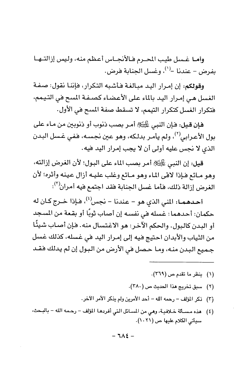 أحدهما: المني الذي هو - عندنا - نجس، فإذا خرج كان له حكمان: أحدهما: غسله في نفسه عن أصاب ثوبا أو بقعة من المسجد أو البدن كالبول. والحكم الآخر: هو الاغتسال منه. فإن أصاب شيئا من الثياب والأبدان احتيج فيه إلى إمرار اليد في غسله، كذلك غسل جميع البدن منه، وما حصل في الأرض من البول إن لم يدلك فقد