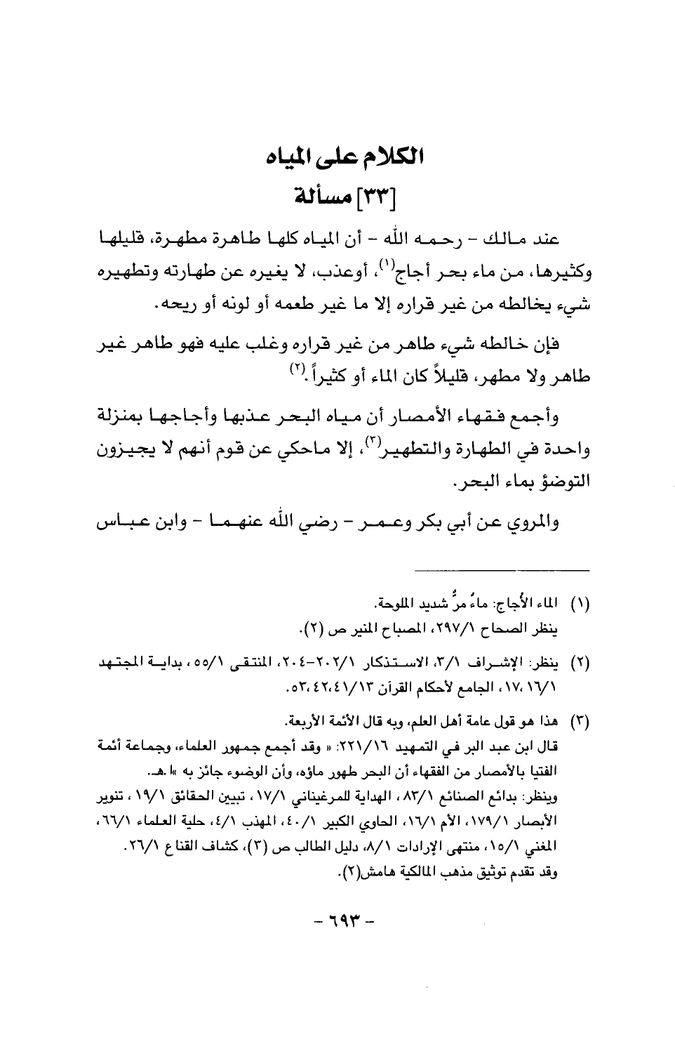 وأجمع فقهاء الأمصار أن مياه البحر عذبها وأجاجها بمنزلة واحدة في الطهارة والتطهير، إلا ما حكى عن قوم أنهم لا يجيزون التوضؤ بماء البحر.