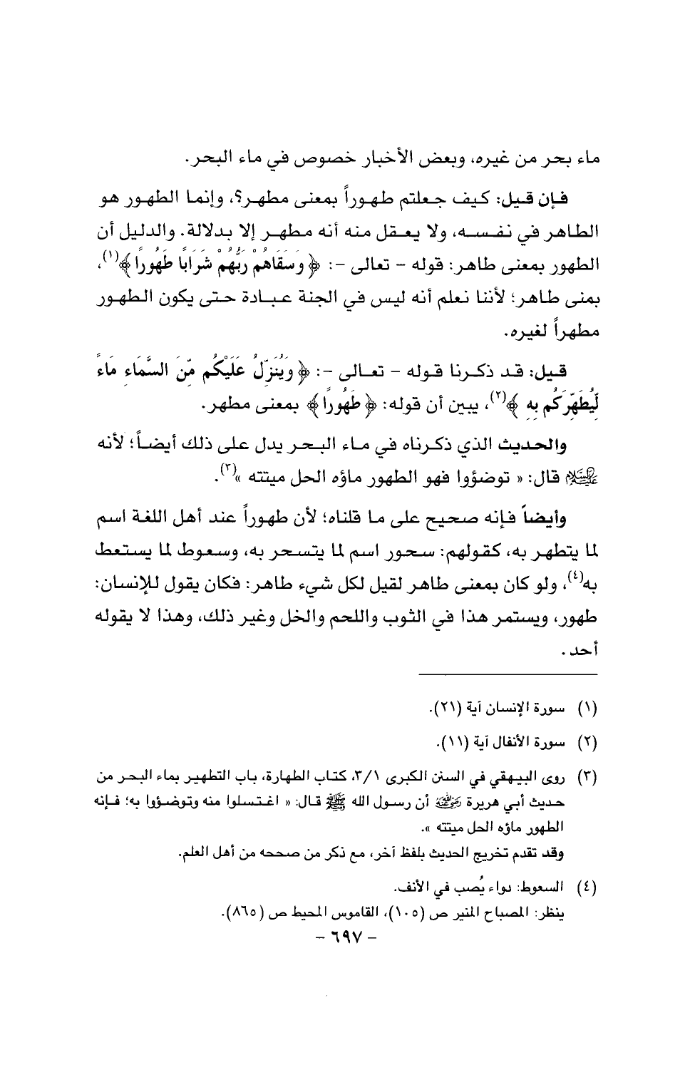 فإن قيل: كيف جعلتم طهورا بمعنى مطهر؟، وإنما الطهور هو الطاهر في نفسه، ولا يعقل منه أنه مطهر إلا بدلالة. والدليل أن الطهور بمعنى طاهر: قوله - تعالى -: {وسقاهم ربهم شرابا طهورا {. بمعنى طاهر؛ لأننا نعلم أنه ليس في الجنة عبادة حتى يكون الطهور مطهرا لغيره.
