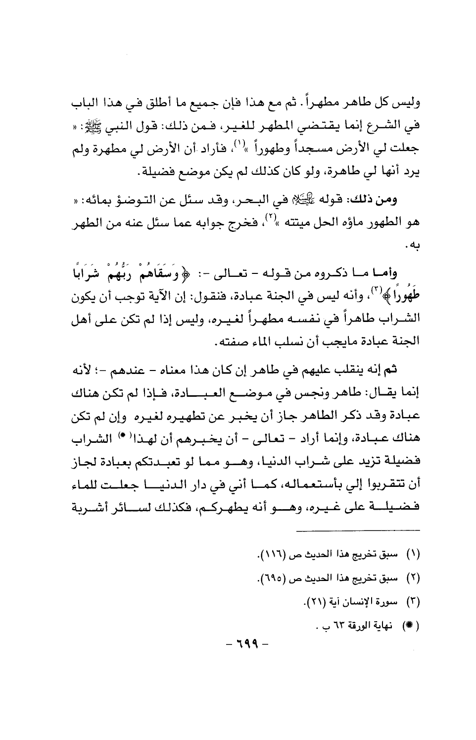 وأما ما ذكروه من قوله - تعالى -: {وسقاهم ربهم شرابا طهورا}، وأنه ليس في الجنة عبادة، فنقول: إن الآية توجب أن يكون الشراب طاهرا في نفسه مطهرا لغيره، وليس إذا لم تكن على أهل الجنة عبادة ما يجب أن نسلب الماء صفته.