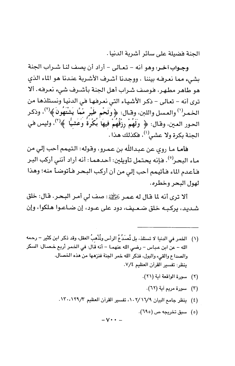 وجواب آخر: وهو أنه - تعالى - أراد أن يصف لنا شراب الجنة بشيء مما نعرفه بيننا، ووجدنا أشرف الأشربة عندنا هو الماء الذي هو طاهر مطهر، فوصف شراب أهل الجنة بأشرف شيء نعرفه. ألا ترى أنه - تعالى - ذكر الأشياء التي نعرفها في الدنيا ونستلذها من الخمر والعسل واللبن، وقال: {ولحم طير مما تشتهون}، وذكر الحور العين، وقال: {ولهم رزقهم فيها بكرة وعشيا}، وليس في الجنة بكرة ولا عشي، فكذلك هذا.