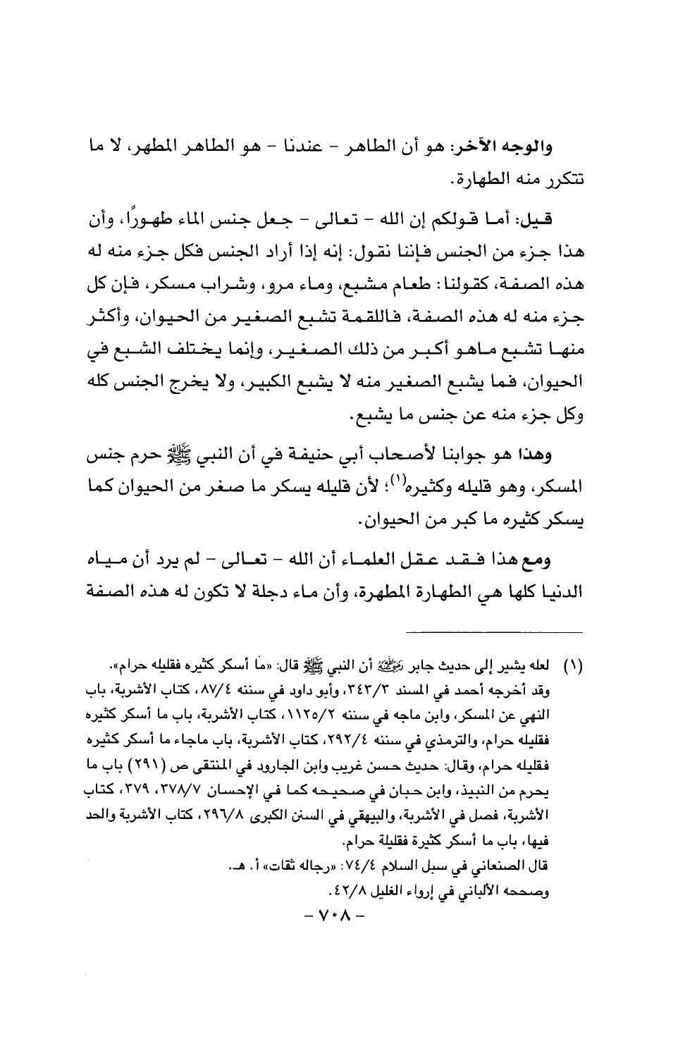 قيل: أما قولكم إن الله - تعالى - جعل جنس الماء طهورا، وأن هذا جزء من الجنس فإننا نقول: إنه إذا أراد الجنس فكل جزء منه له هذه الصفة، كقولنا: طعام مشبع، وماء مرو، وشراب مسكر، فإن كل جزء منه له هذه الصفة، فاللقمة تشبع الغير من الحيوان، وأكثر منها تشبع ما هو أكبر من ذلك الصغير، وإنما يختلف الشبع في الحيوان، فما يشبع الصغير منه لا يشبع الكبير، ولا يخرج الجنس كله وكل جزء منه على جنس ما يشبع.