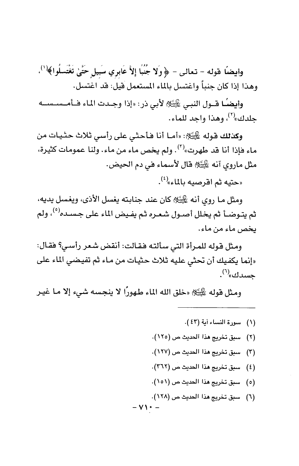 وكذلك قوله عليه السلام: (أما انا فأحثي على رأسي ثلاث حثيات من ماء فإذا أنا قد طهرت) لا، ولم يخص ماء من ماء. ولنا عمومات كثيرة، مثل ما روي أنه عليه السلام قال لأسماء في دم الحيض.